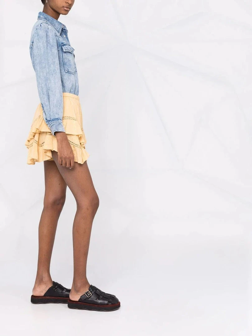 Isabel Marant Etoile honey ‘Jocadia’ shorts featuring an elasticated waistband, lace detailing, a tiered ruffle design, a thigh high length and pulls on. Item fits true to size. Model is wearing a size 36 FR.Â