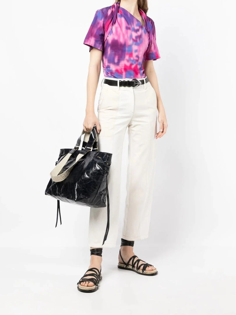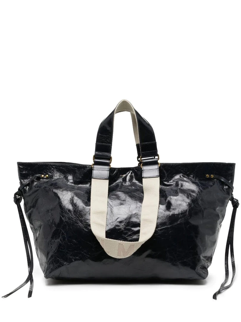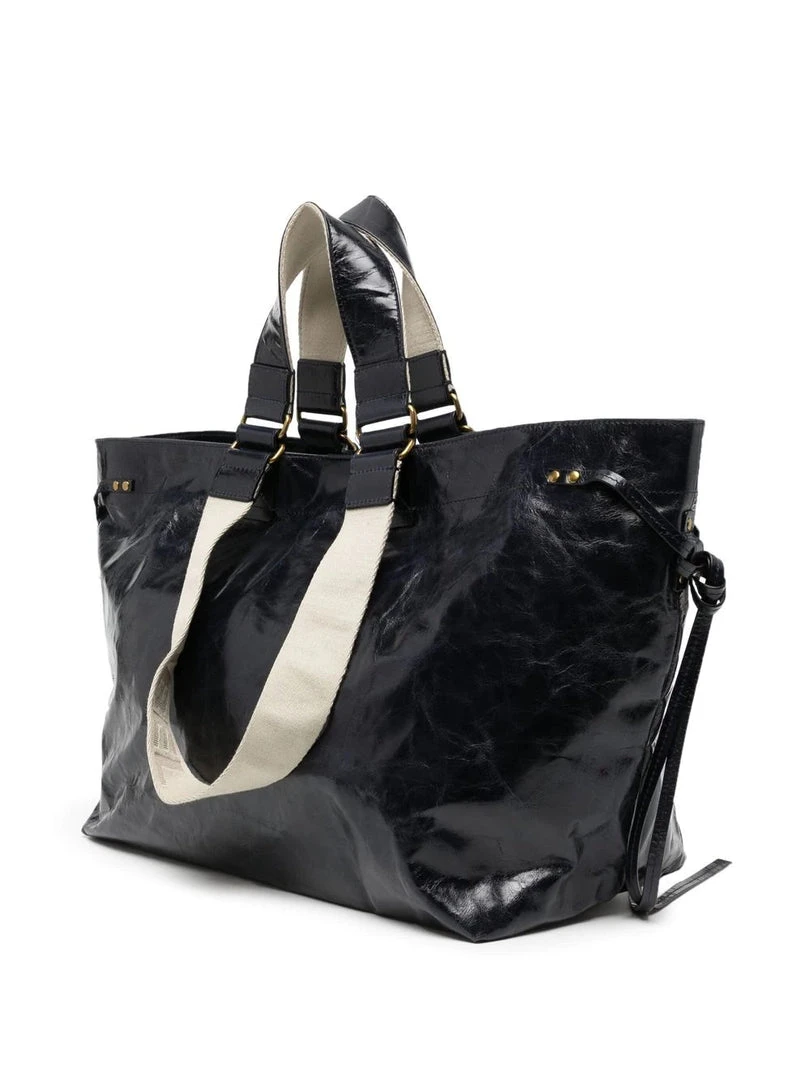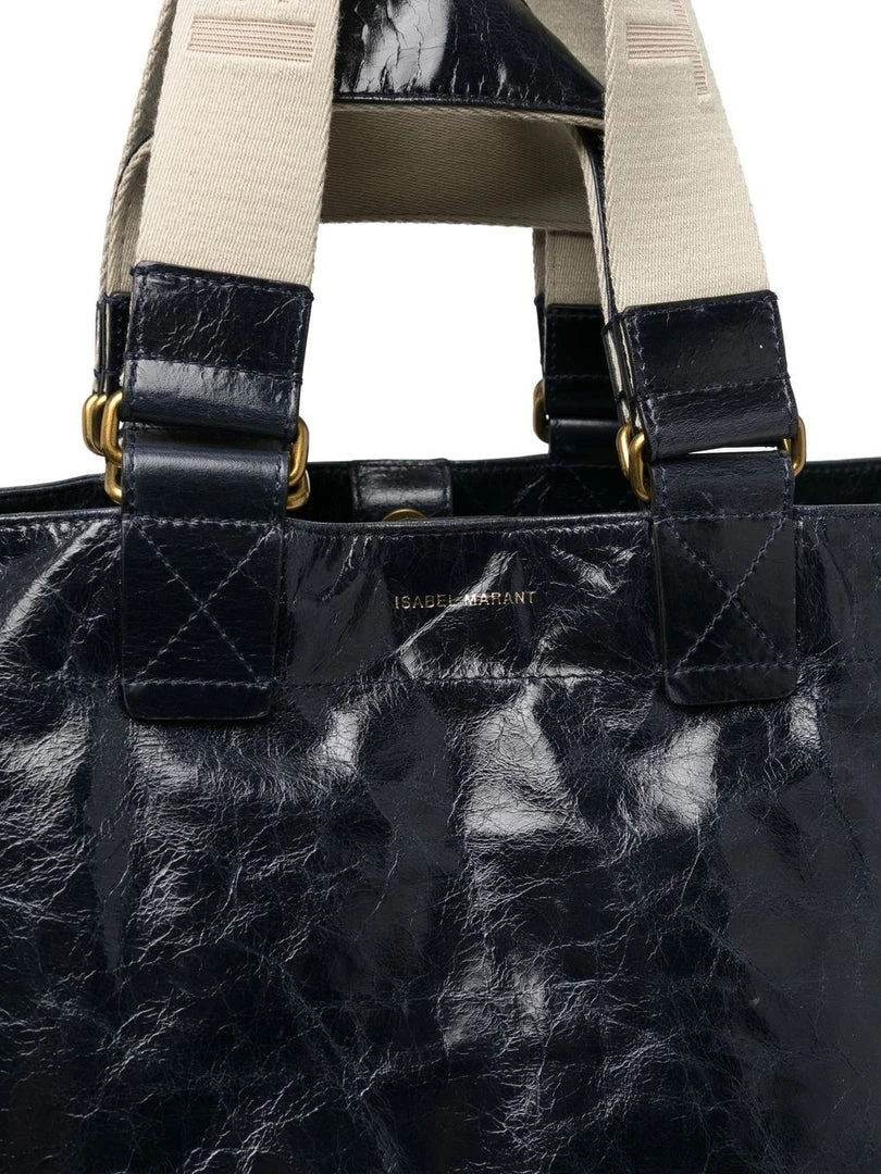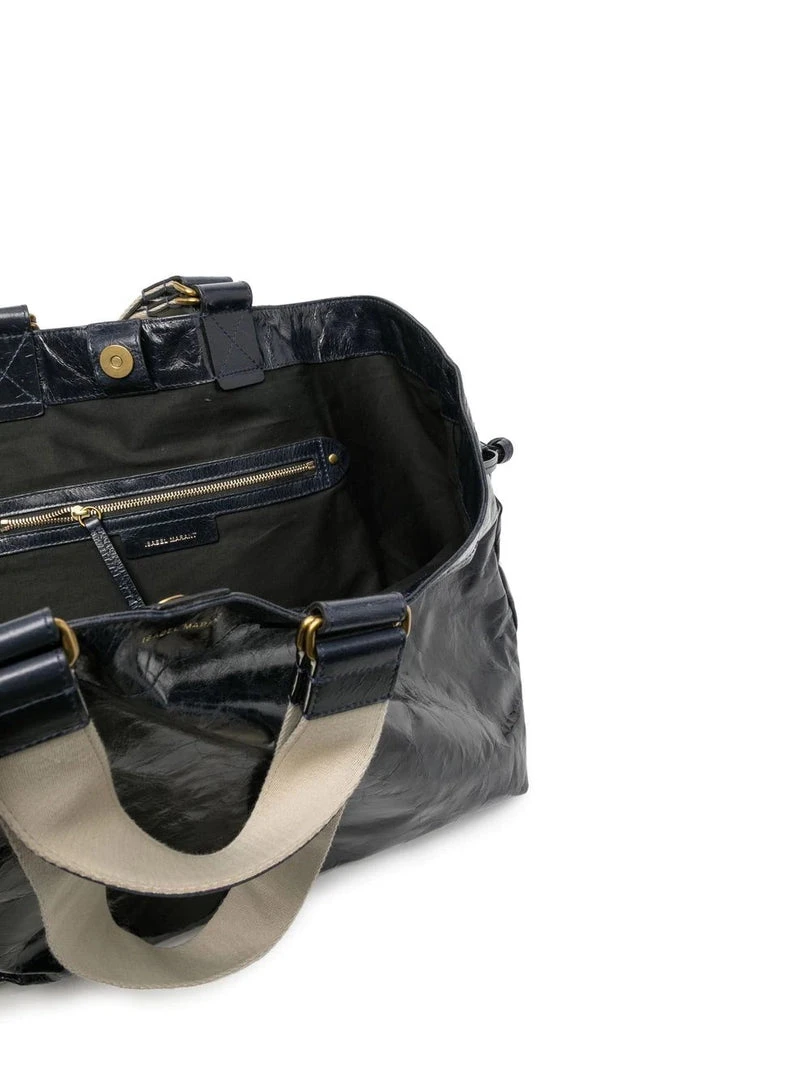 Isabel Marant faded blue ‘Wardy’ tote bag featuring four top handles with logo detailing, side tie details, a crinkled effect, an inner magnetic button fastening and an internal side zip pocket. One Size.