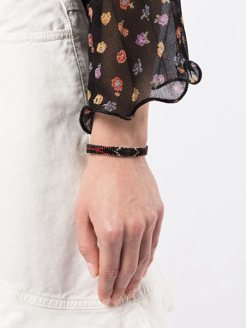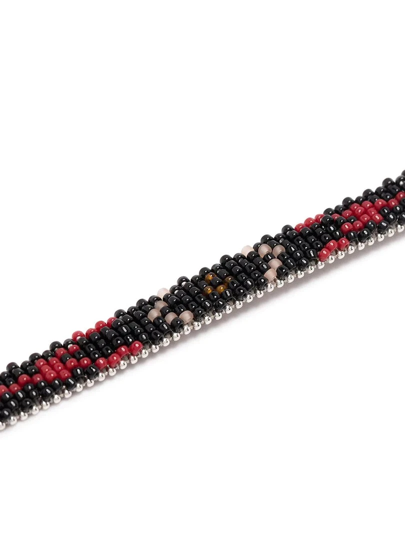 Isabel Marant ‘Glass Bead Bracelet’ featuring a red, black and silver Aztec glass bead design and an adjustable silver clasp fastening. Made in Philippines. One Size.