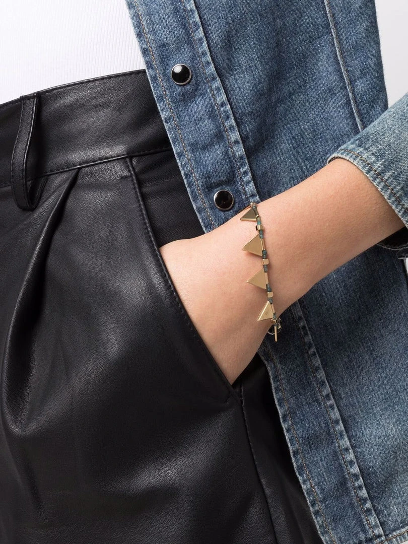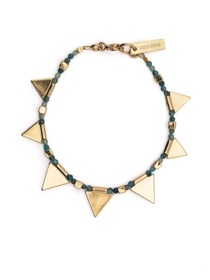 Isabel Marant ‘Rocio’ bracelet featuring a spring ring fastening, a green beaded design with triangular details and gold tone hardware. Made in Poland.