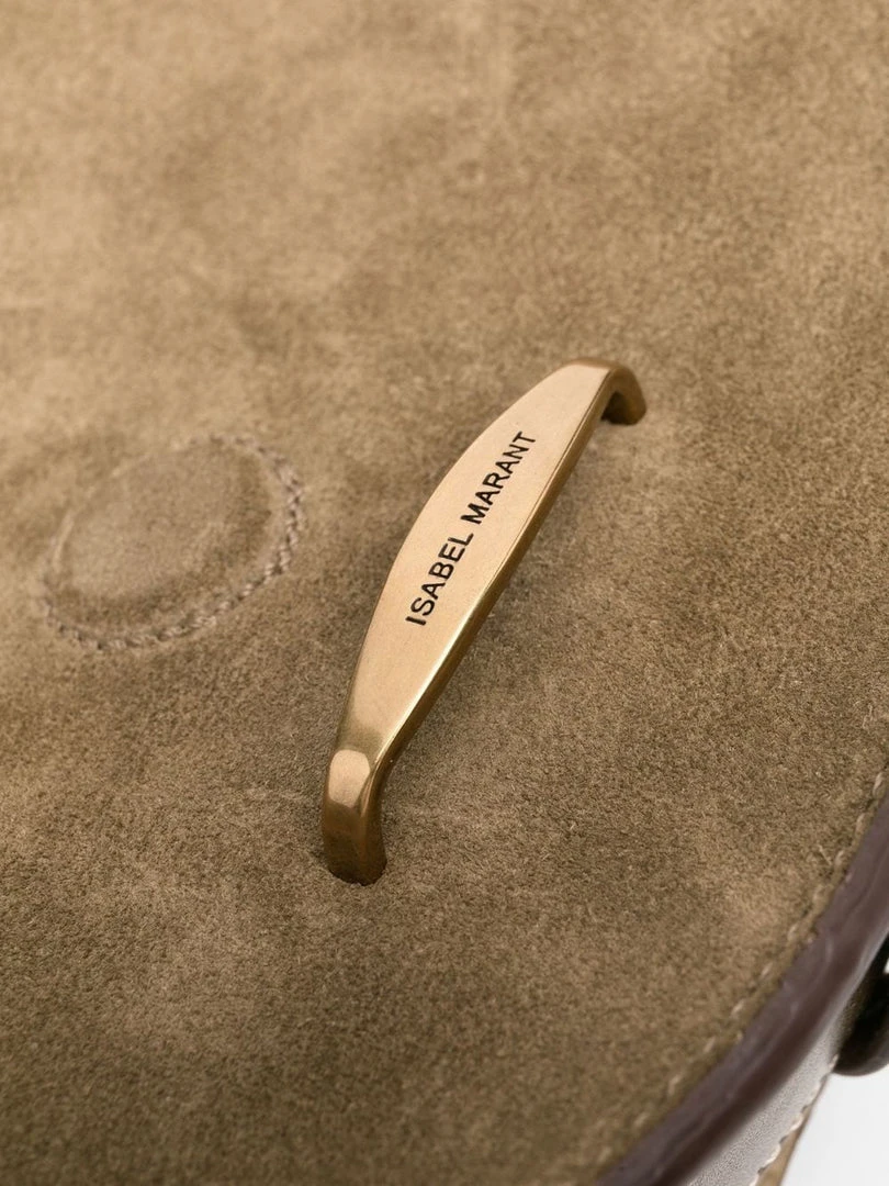 Isabel Marant khaki ‘Botsy’ suede bag featuring a front flap closure, an adjustable shoulder strap, internal and rear slip pockets, gold-tone hardware and a logo stamp detail to the back. One Size.
