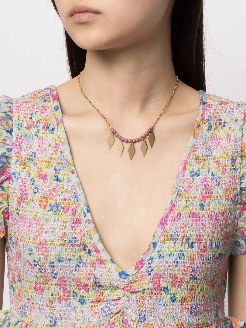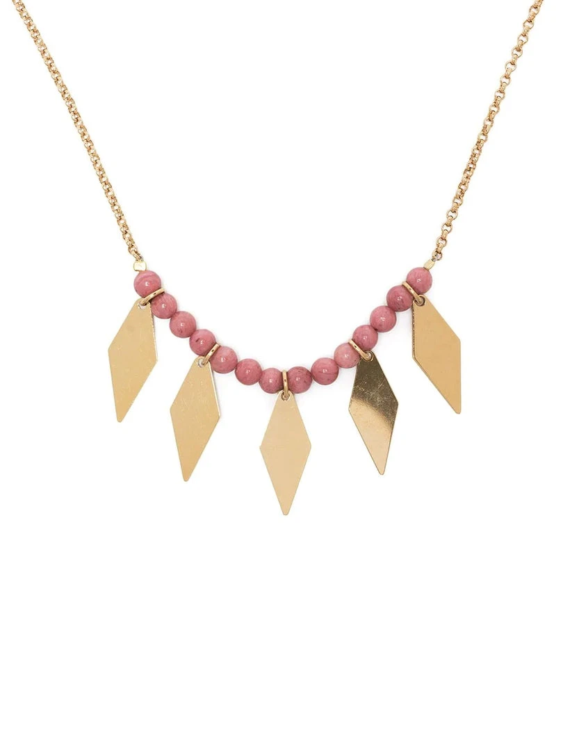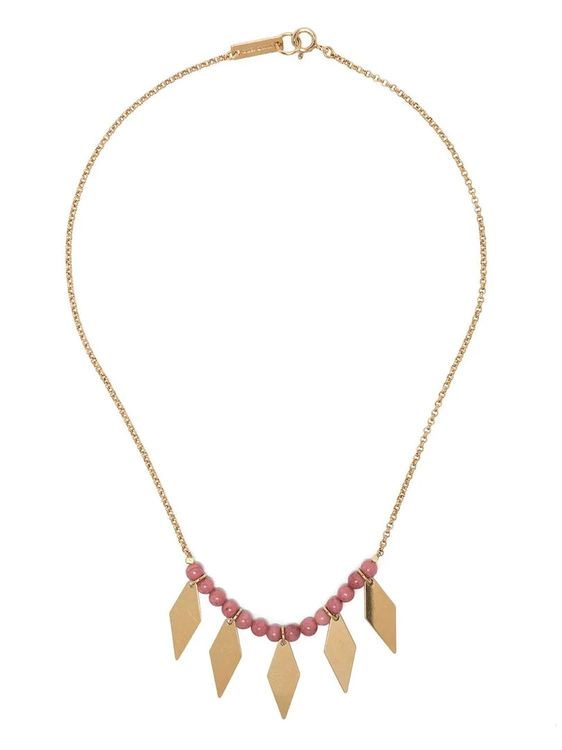 Isabel Marant ‘Harlow’ necklace featuring a spring ring fastening, a pink beaded design with gold pendants and gold tone hardware. Made in Poland.