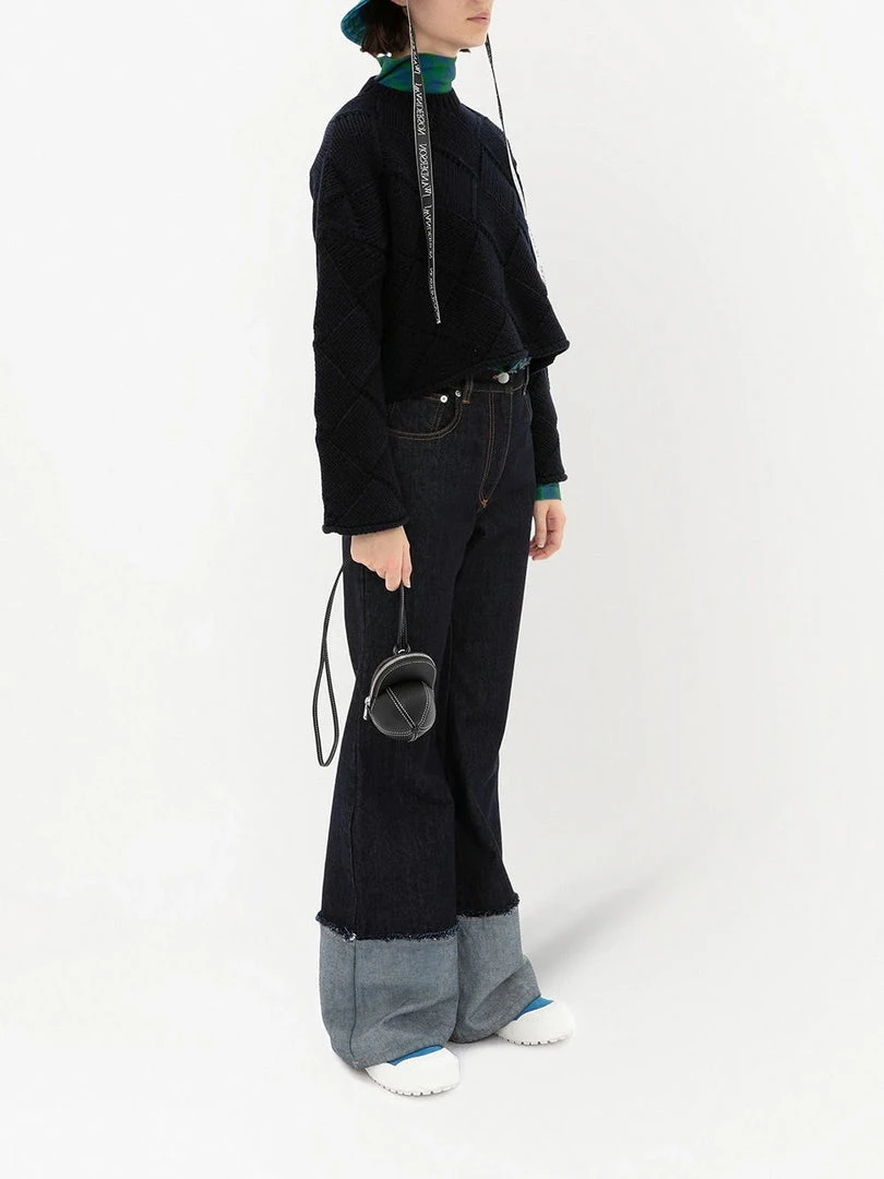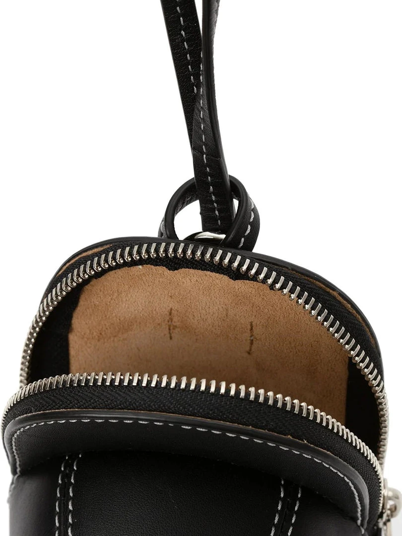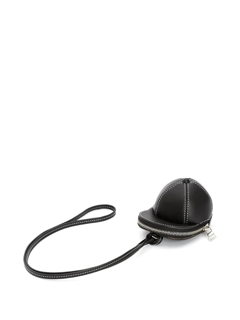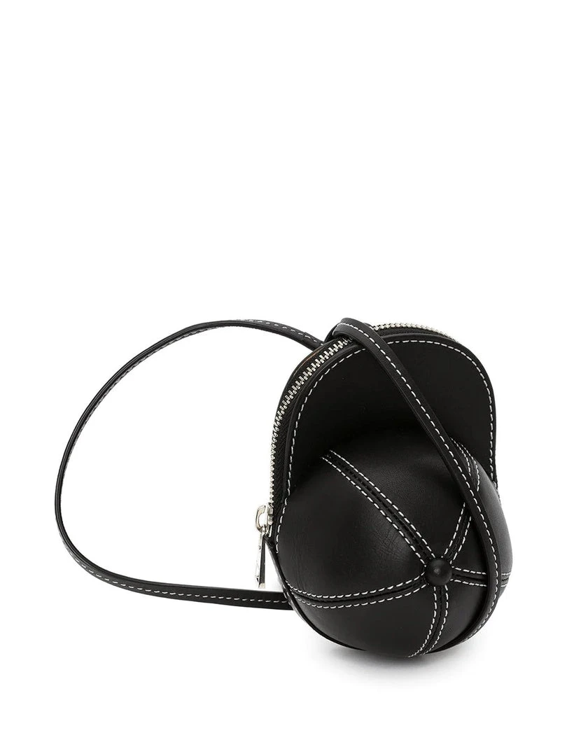 JW Anderson black ‘Mini Nano Cap Bag’ featuring a long shoulder or hand strap, a zip fastening, contrasting white stitching and silver tone hardware. Made in Hungary.