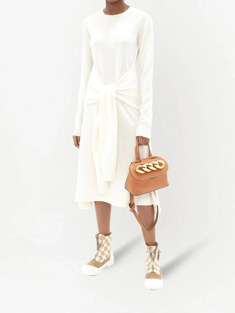 JW Anderson pecan brown ‘Small Chain Lid Bag’ featuring a top handle and an adjustable long strap, a gold tone chain detail on the front, a magnetic lid closure, an inner side slip pocket and outer back slip pocket, a brand logo embossing on the back and a soft leather finish. Made in Portugal.