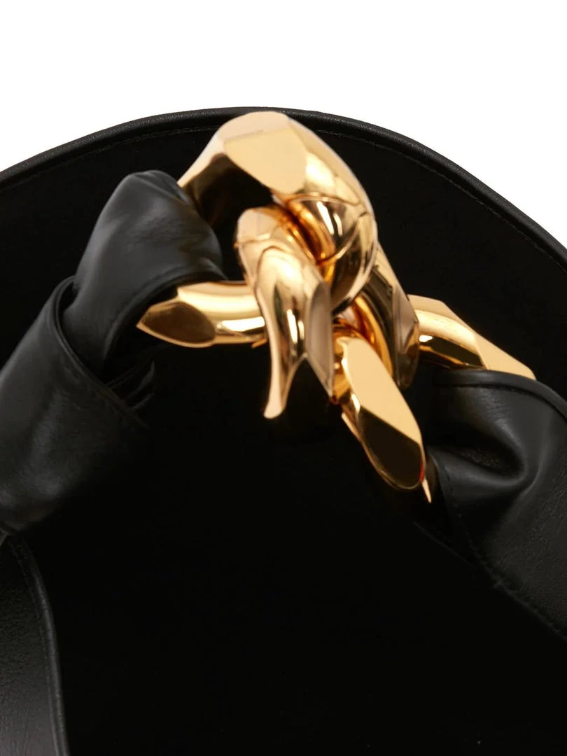 JW Anderson black ‘Small Chain Hobo’ handbag featuring an oversized chain link top handle, a magnetic closure, an embossed brand logo on the front and gold tone hardware. Made in Spain.