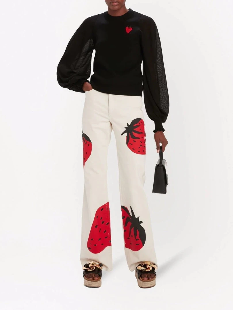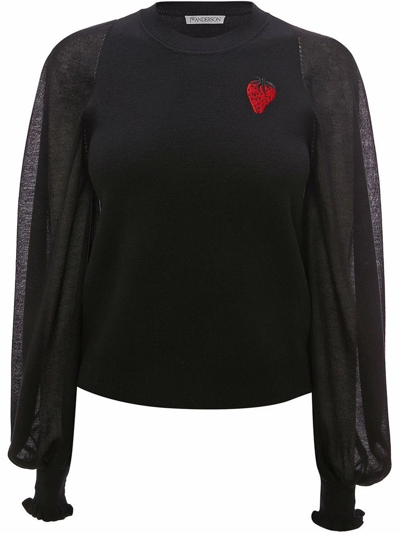 JW Anderson black ‘Strawberry Sheer Sleeve Jumper’ featuring a crew neckline, long sheer sleeves with ruffled cuffs, a red embroidered strawberry patch on the chest, a ribbed hemline and pulls on. Item fits true to size. Model is wearing a size S.