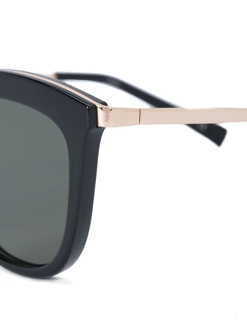 Le Specs black and gold ‘Caliente’ sunglasses featuring a cat eye frame, straight gold metal arms and black curved tips. These glasses come with a protective case. One Size. Made in China.