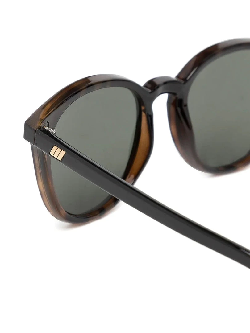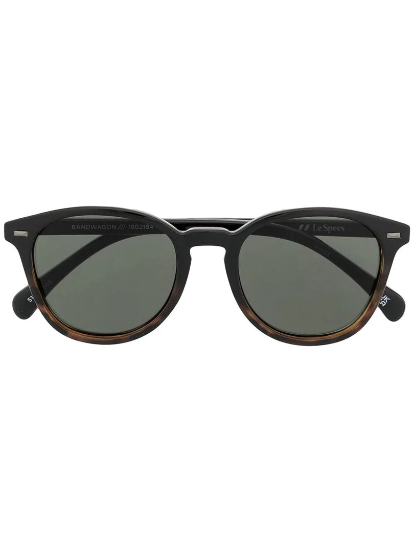Le Specs unisex black tortoiseshell ‘Bandwagon’ sunglasses featuring a round frame, the brands flag stripe detail on the sides, straight arms and curved tips. These glasses come with a protective case. One Size. Made in China.