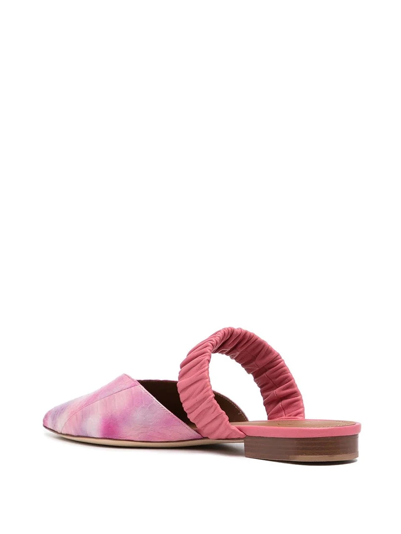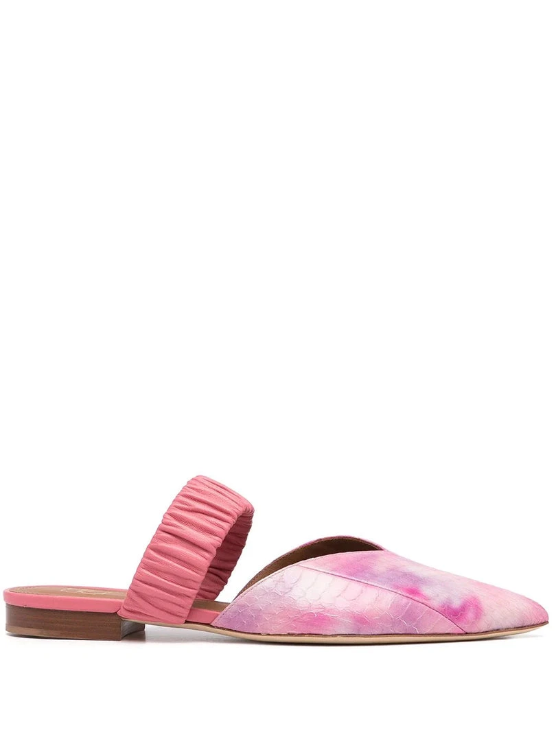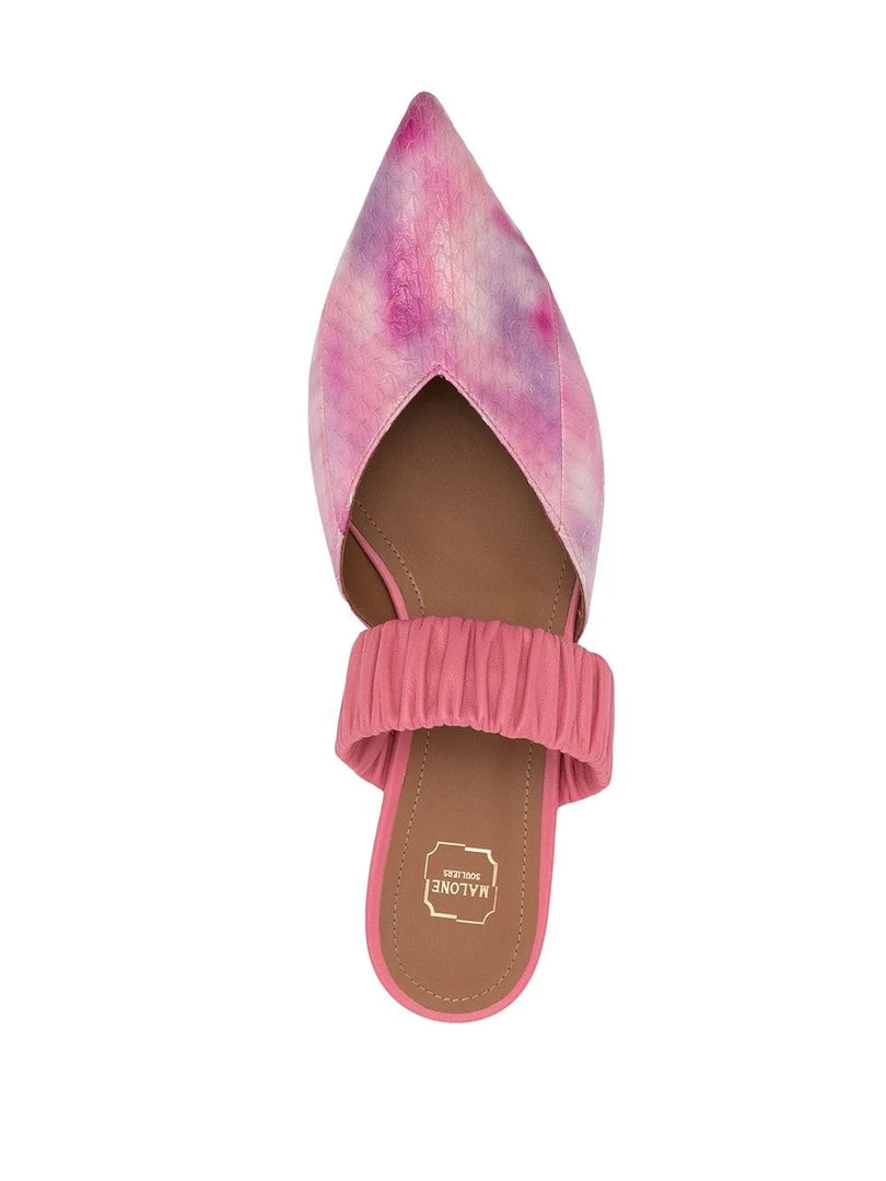 Malone Souliers ‘Matilda’ pink croc effect flat mules featuring a pointed toe, an elasticated scrunched detail strap, an open back, a pink and purple croc effect print and slips on. Item fits true to size. Italian Sizing. Made in Italy.Â