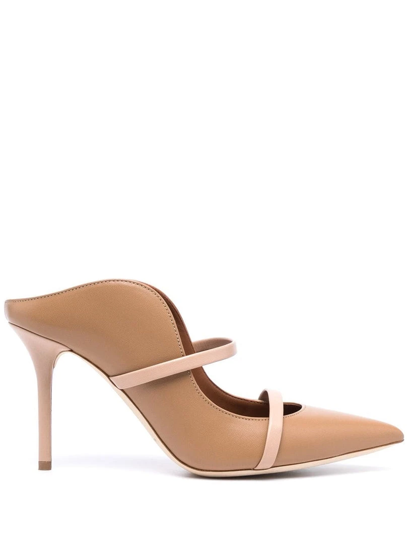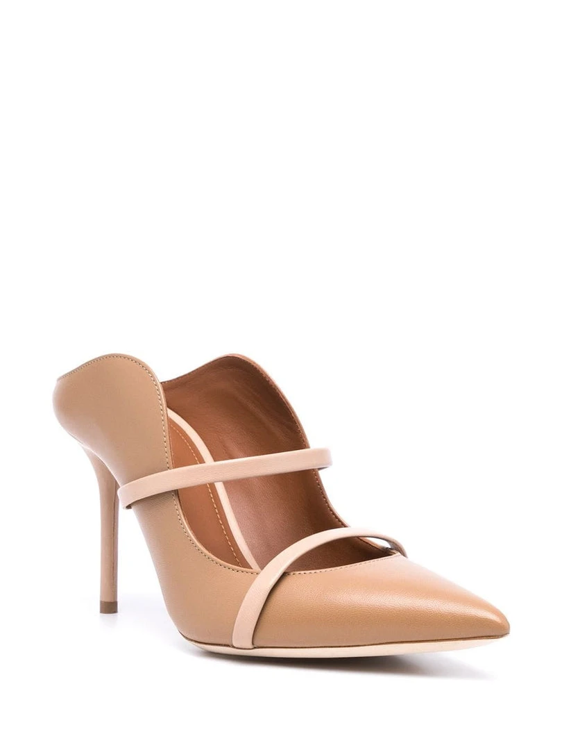 Malone Souliers beige ‘Maureen 85’ stiletto mules featuring a pointed toe, two contrasting leather top straps, signature curved sides, an open back and a stiletto heel. Item fits true to size. Italian Sizing. Made in Italy.