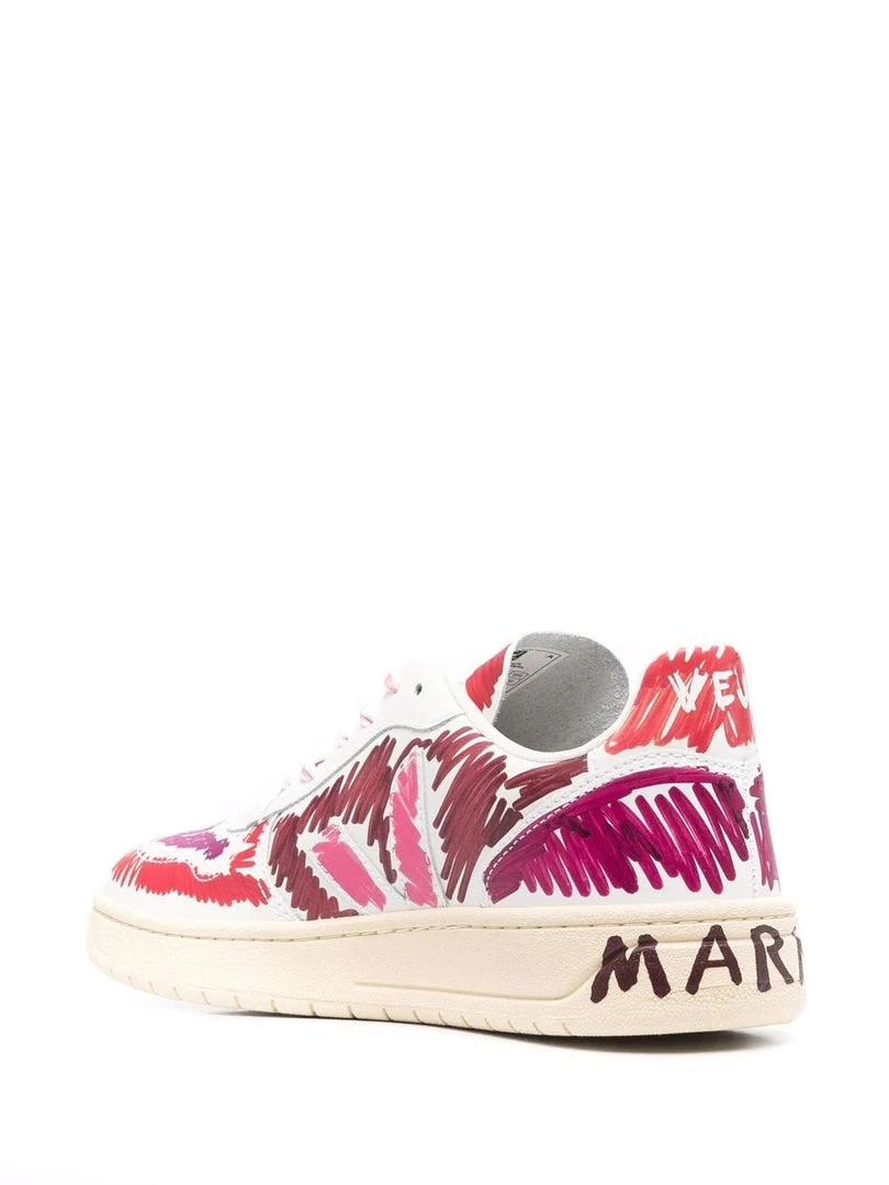 ‘Veja x Marni V-10 Trainers’ featuring a round toe, a front white and pink lace up fastening, a signature ‘v’ design on the sides, a red and pink scribbled design and a branded tongue and insole. Made in Brazil. Item fits true to size. European Sizing.