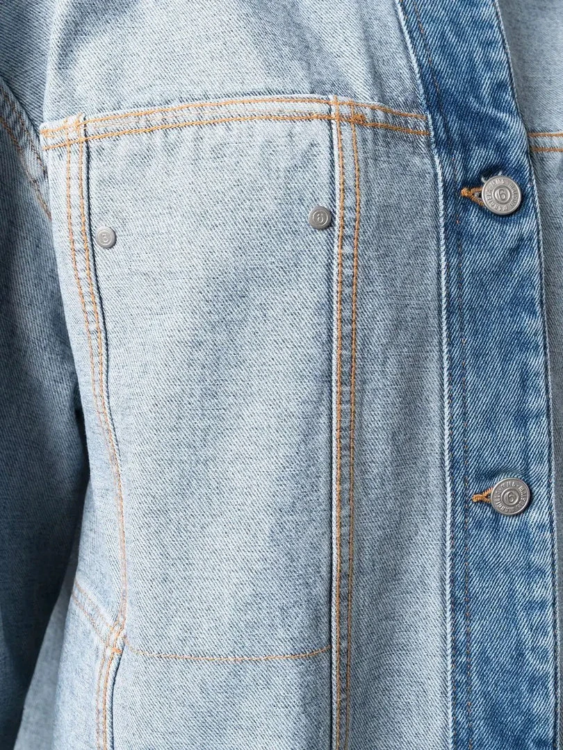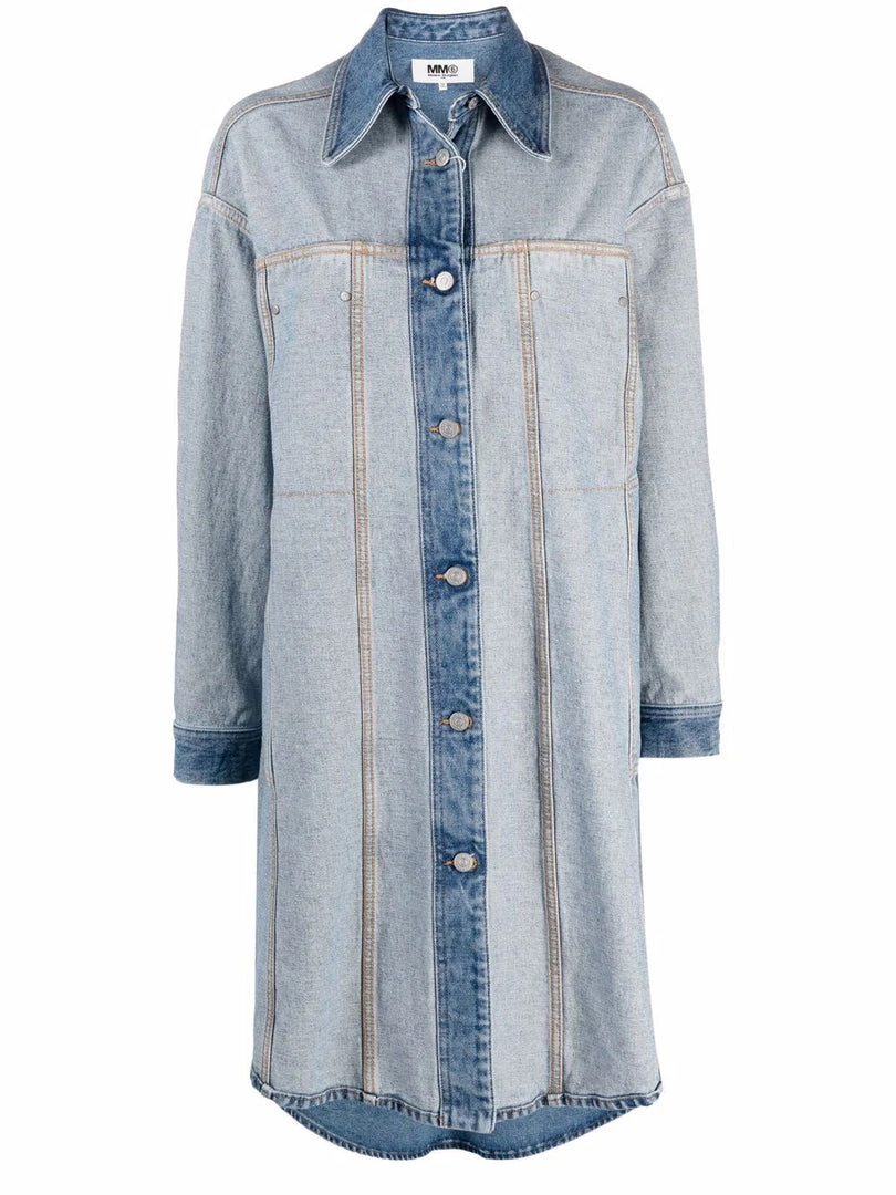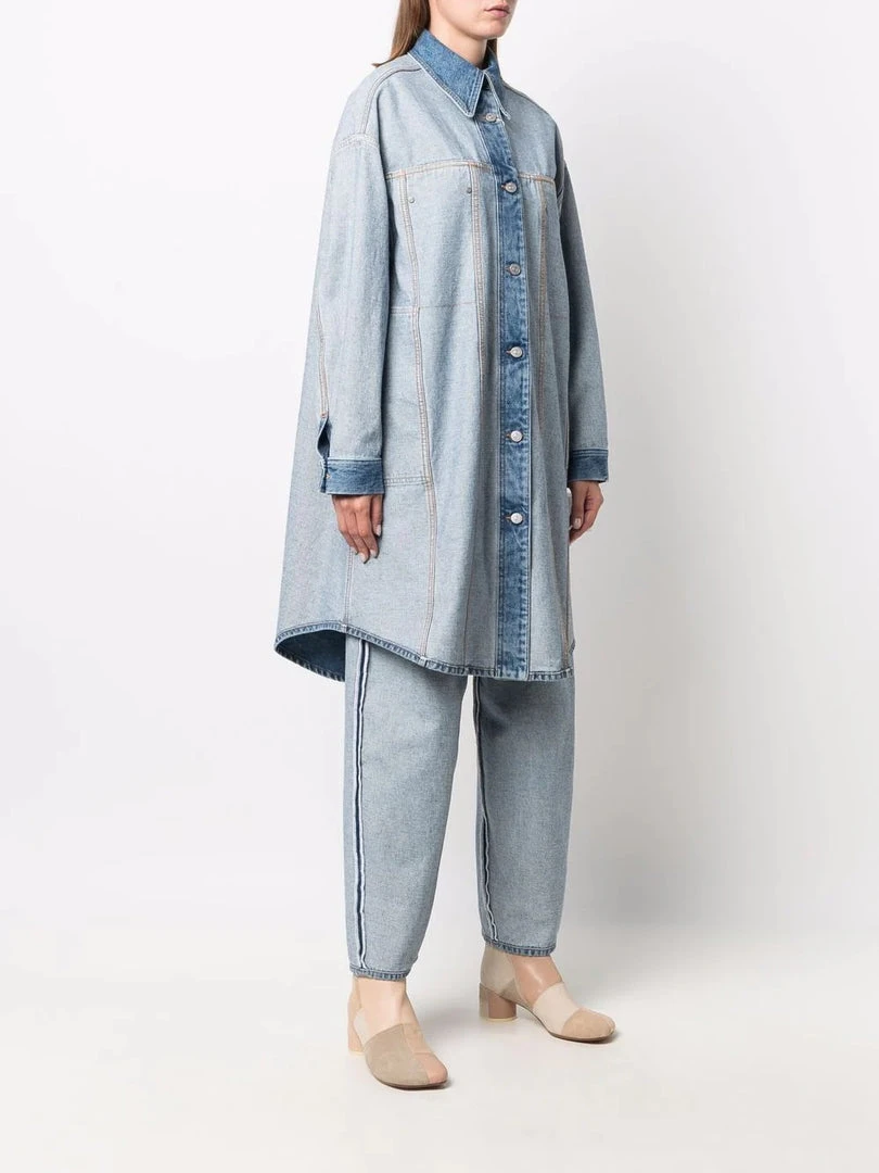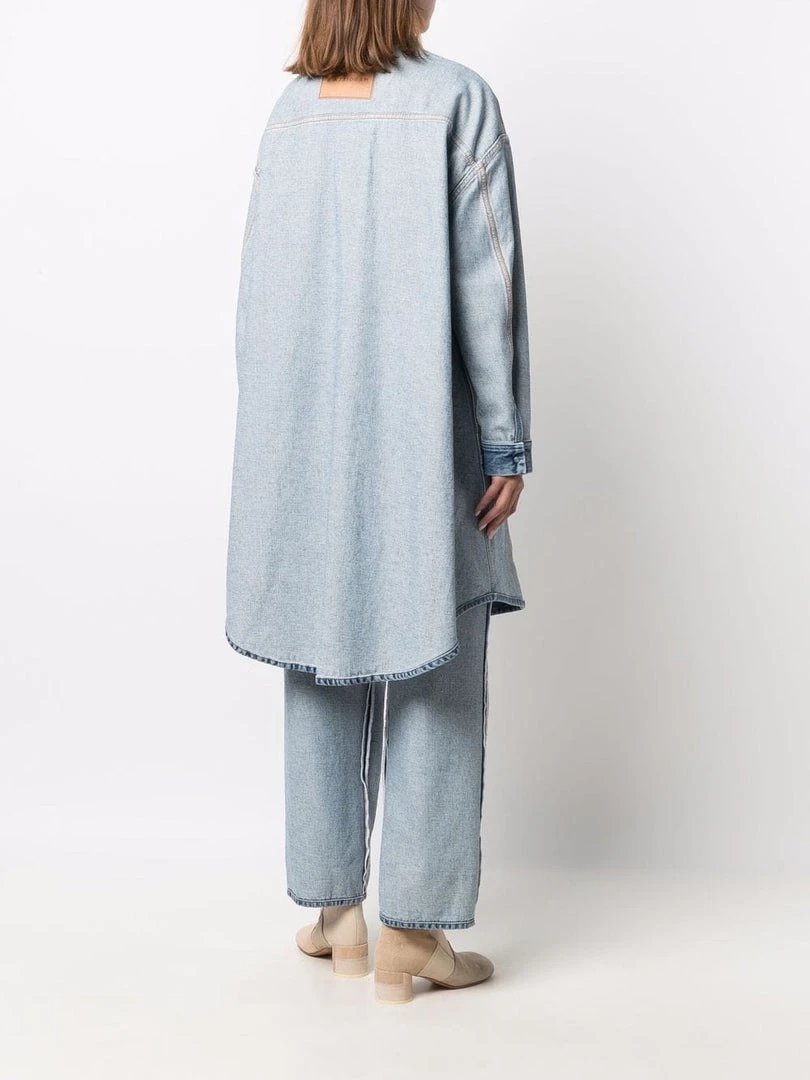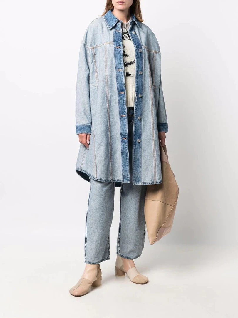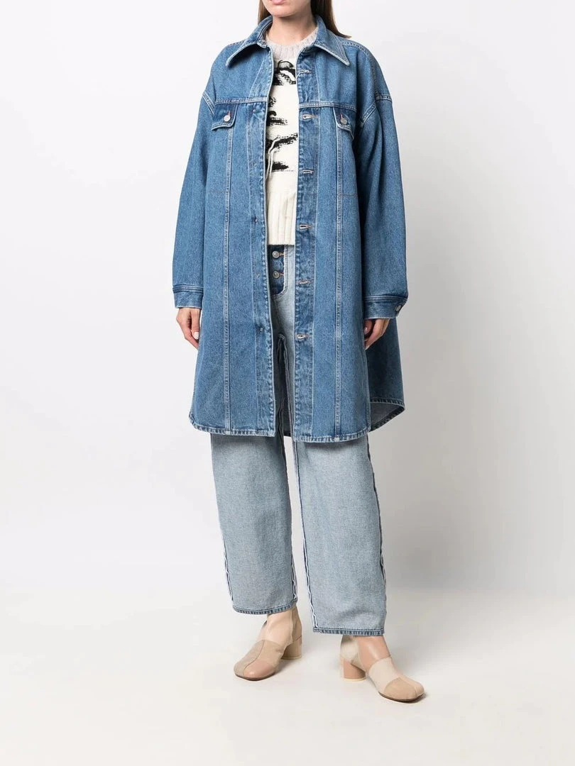 MM6 Maison Margiela ‘Oversized Reversible Long Denim Jacket’ featuring a classic collar, front button fastenings, inner front flap chest pockets, long sleeves with buttoned cuffs, side slit pockets, a signature brand care label detail on the side seam, a curved hemline, a medium blue denim wash and a midi length. Item can be worn inside out. Model is wearing a size 38 IT.