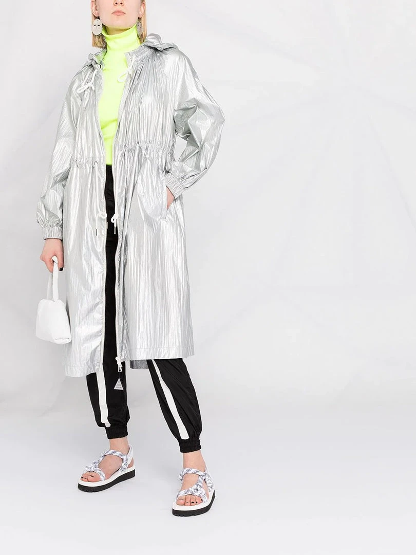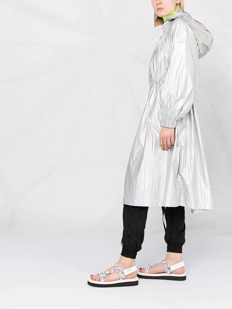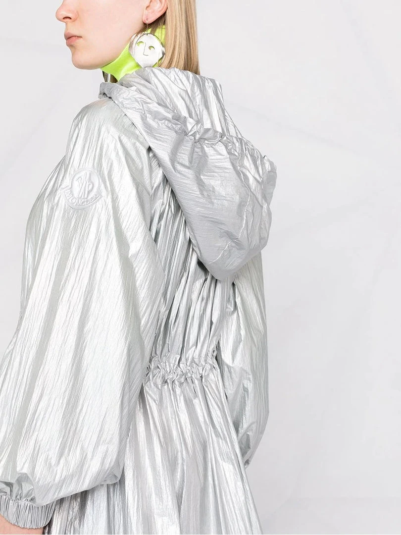 Moncler oversized ‘Akubens’ metallic silver coat featuring a detachable drawstring hood, long sleeves with elasticated cuffs and a logo patch detail on the left arm, a front two-way zip fastening, a drawstring waist, side zip pockets, a creased effect and a midi length. Model is wearing a size 1.