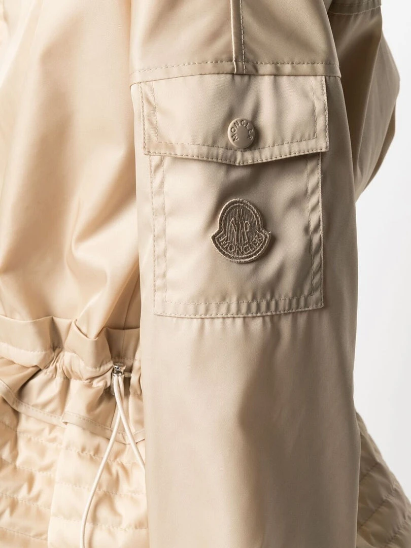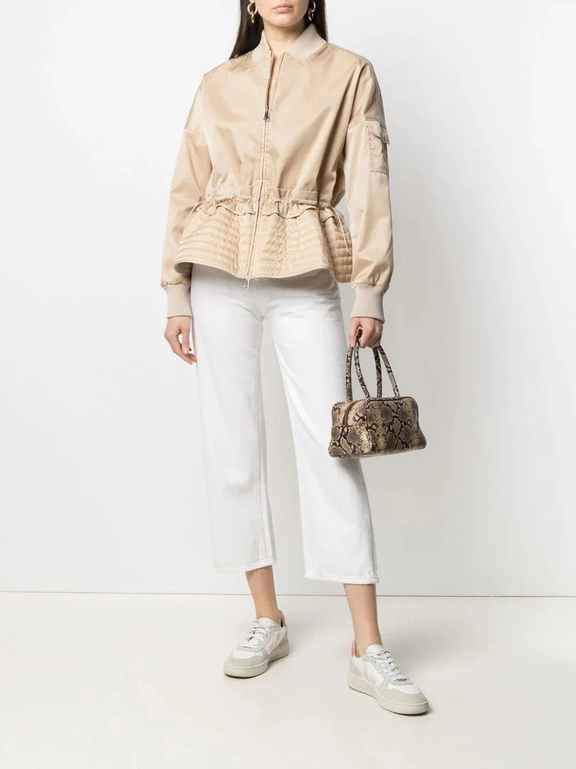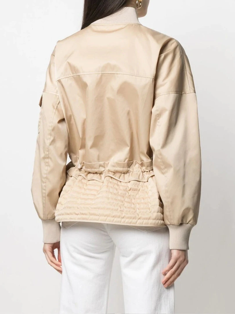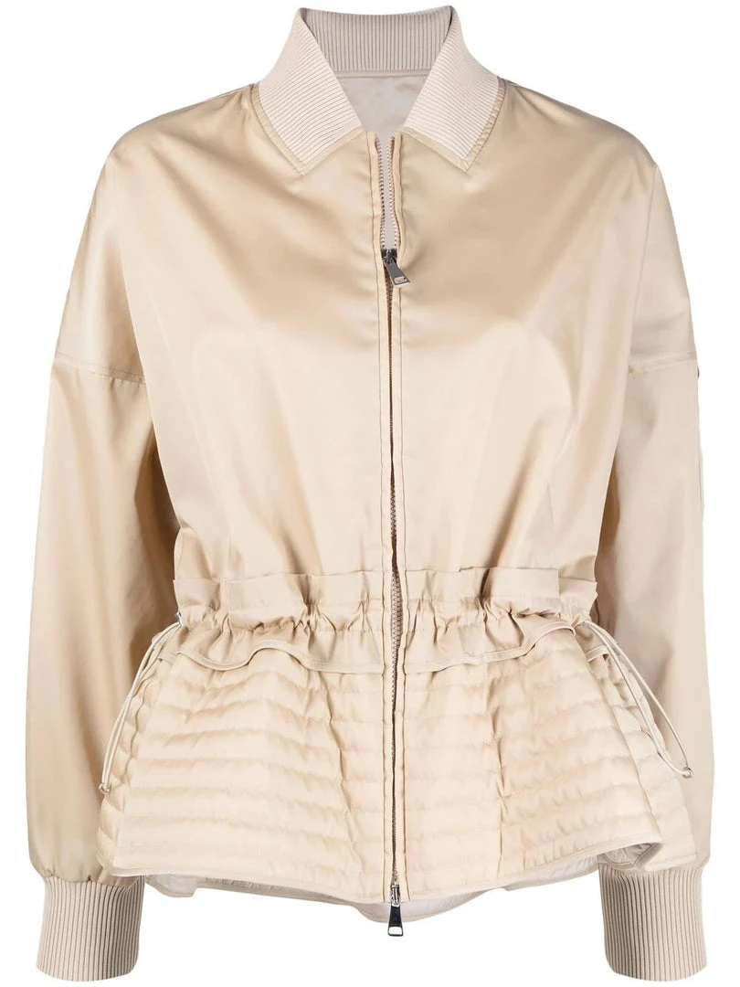 Moncler beige ‘Baldah’ peplum jacket featuring a ribbed collar and cuffs, a front zip fastening, a pocket and logo patch detail on the left arm, long sleeves, a drawstring around waistline, concealed side zip pockets and a quilted hemline. Item fits true to size. Model is wearing a size 1.