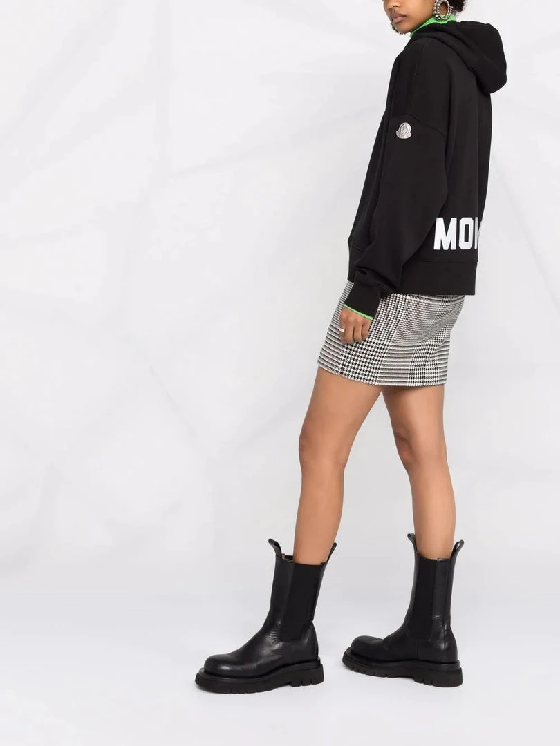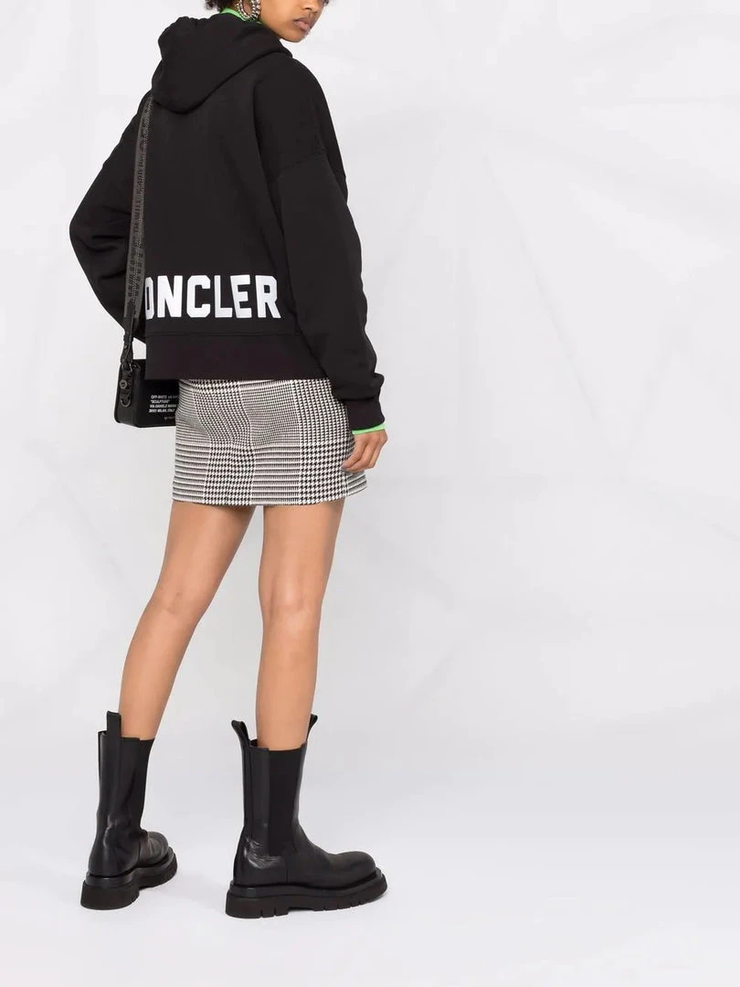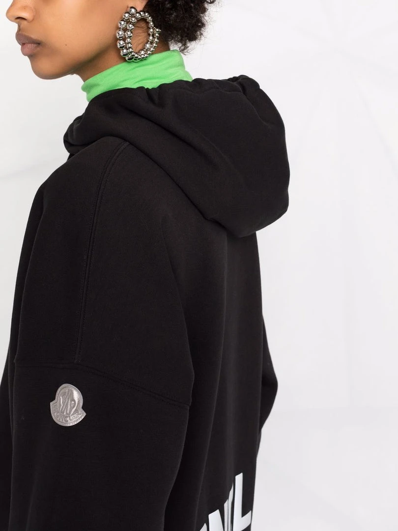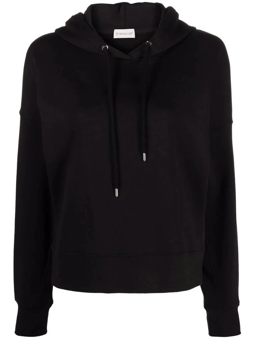 Moncler black ‘Logo Detail Hoodie’ featuring a drawstring hood, long sleeves with a silver logo patch on the left arm, ribbed hems, a silver ‘Moncler’ logo on the back and pulls on. Item fits true to size. Model is wearing a size S.