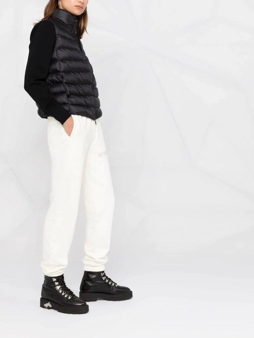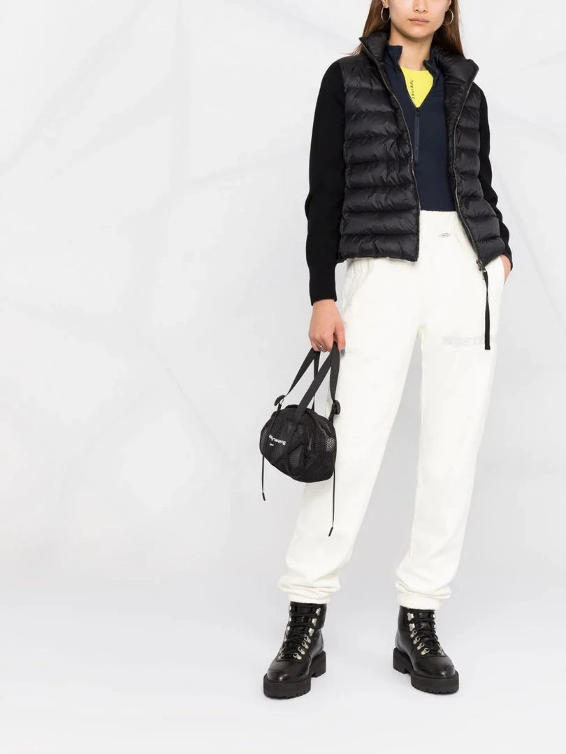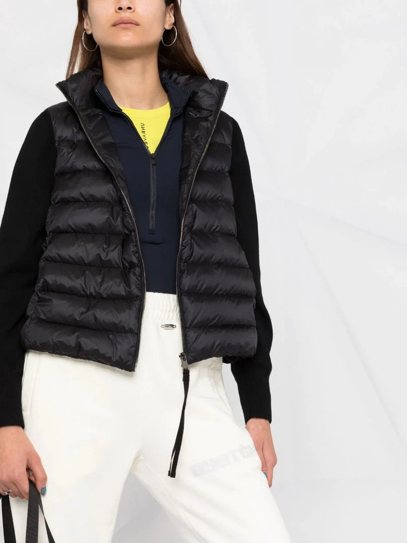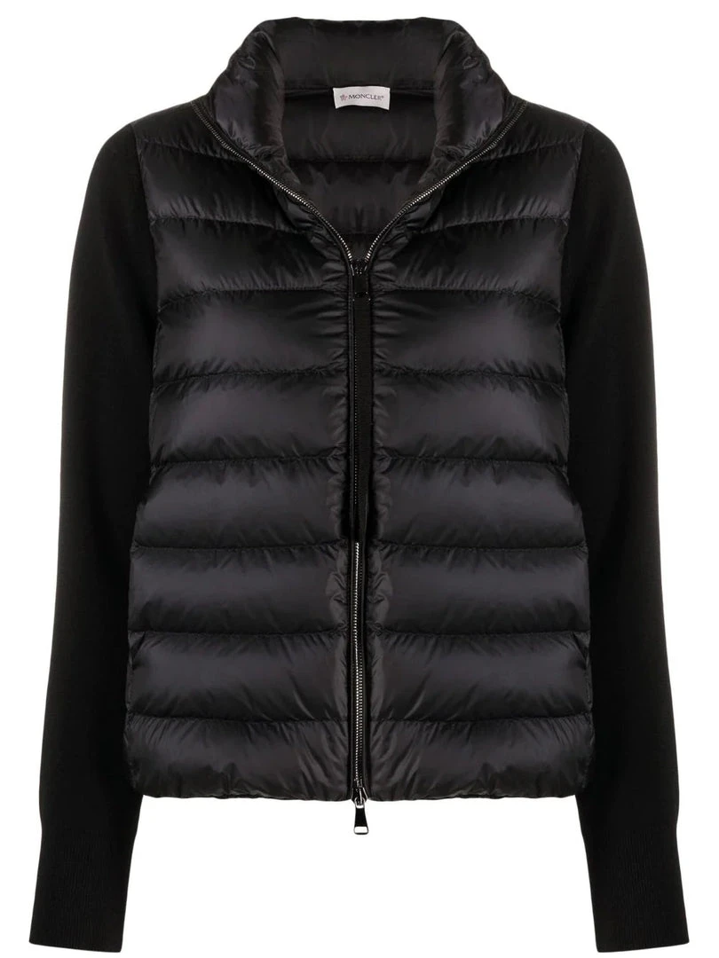 Moncler black ‘Padded Knit Sleeve Jacket’ featuring a high neck, a front two-way zipper fastening, long knitted sleeves with a signature logo patch on the left arm, side slip pockets, a padded bodice and a regular length. Item fits true to size. Model is wearing a size S.