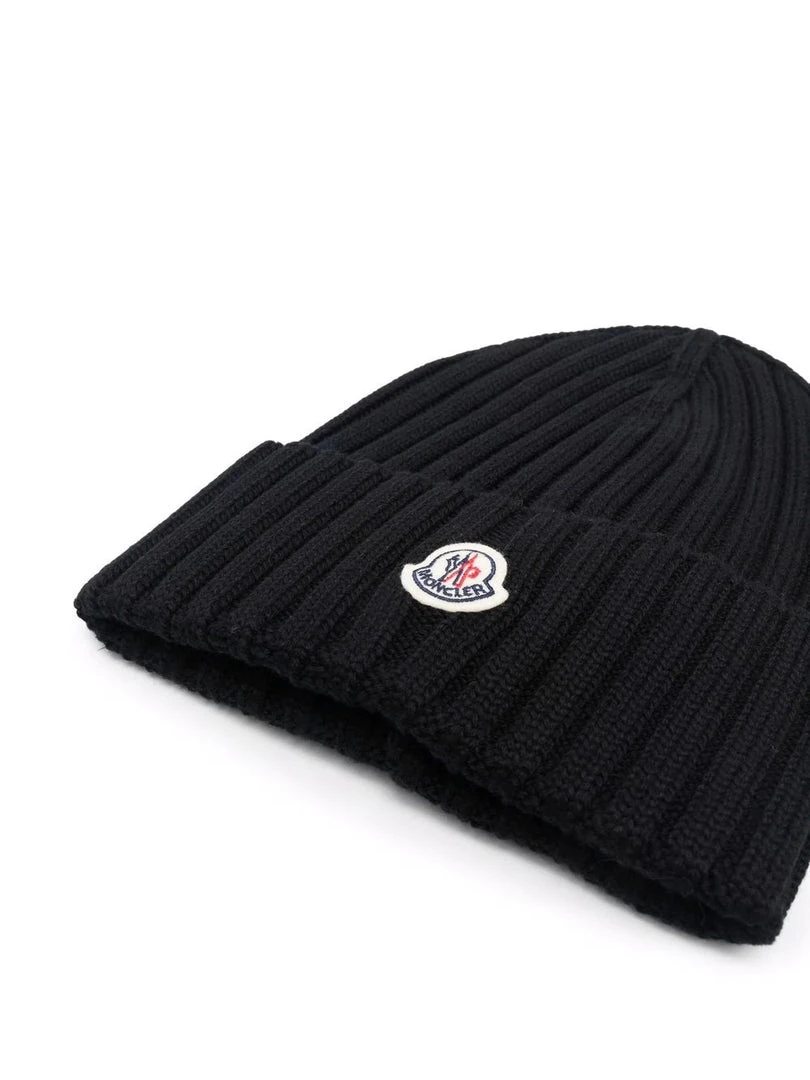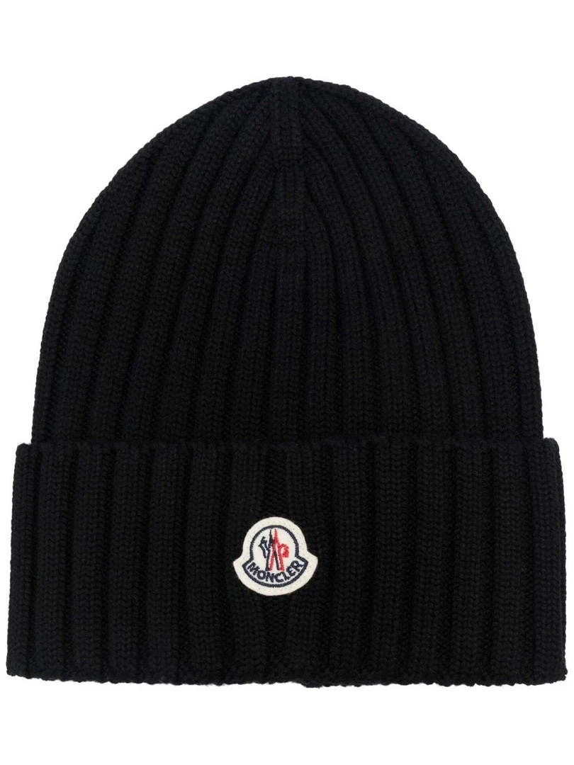 Moncler black ‘Ribbed Logo Beanie Hat’ featuring a front signature logo patch, a ribbed design, a turned up hem and pulls on. Made in Moldova. One Size.
