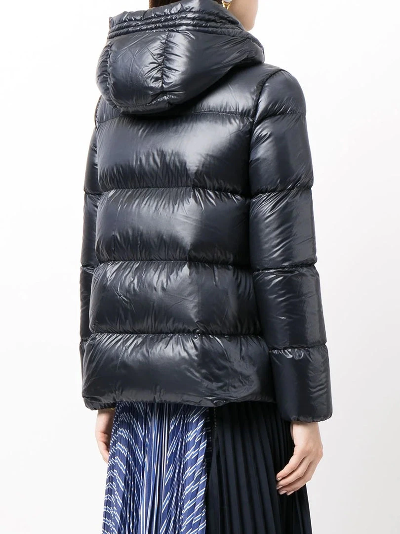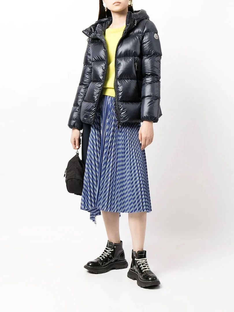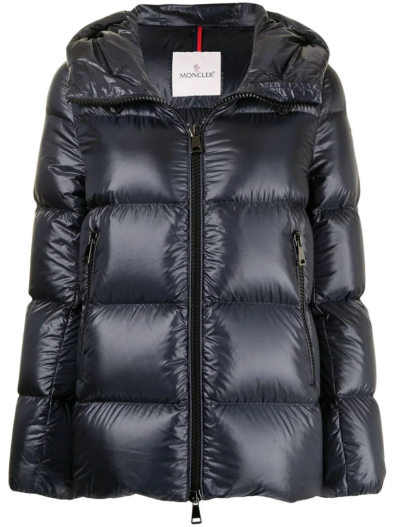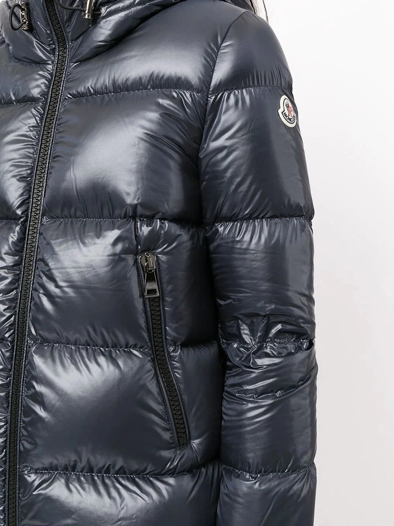 Moncler blue ‘Seritte’ puffer jacket featuring a drawstring hood, a front zip fastening, long sleeves with a logo patch on the left arm, elasticated cuffs, two front zip pockets and a padded design. Item is slightly oversized. Model is wearing a size 0.