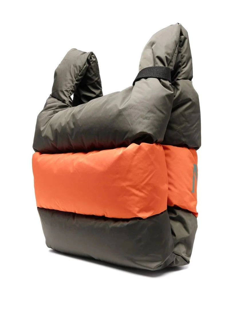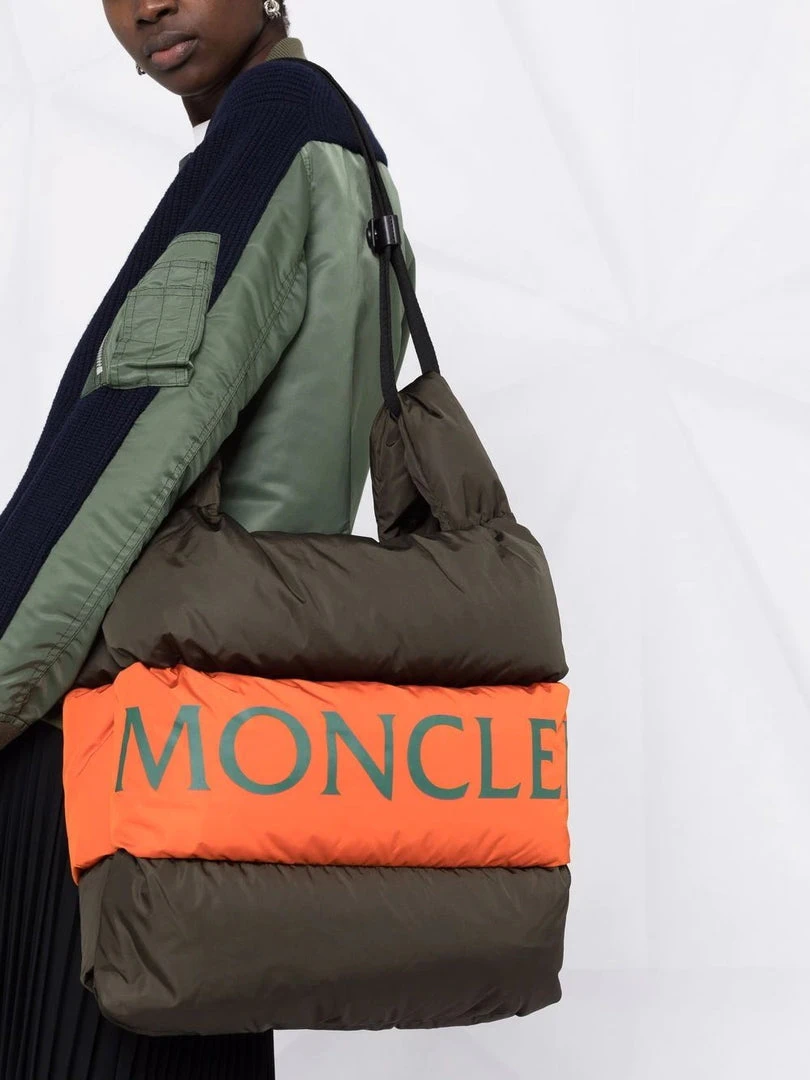 Moncler ‘Legere’ green large tote bag featuring two top handles, an optional and adjustable shoulder strap, a zip fastening, a padded design with an orange stripe front logo detail, an inner two compartment design and a side slip pocket. Comes with a dust bag. Made in Romania. One size.