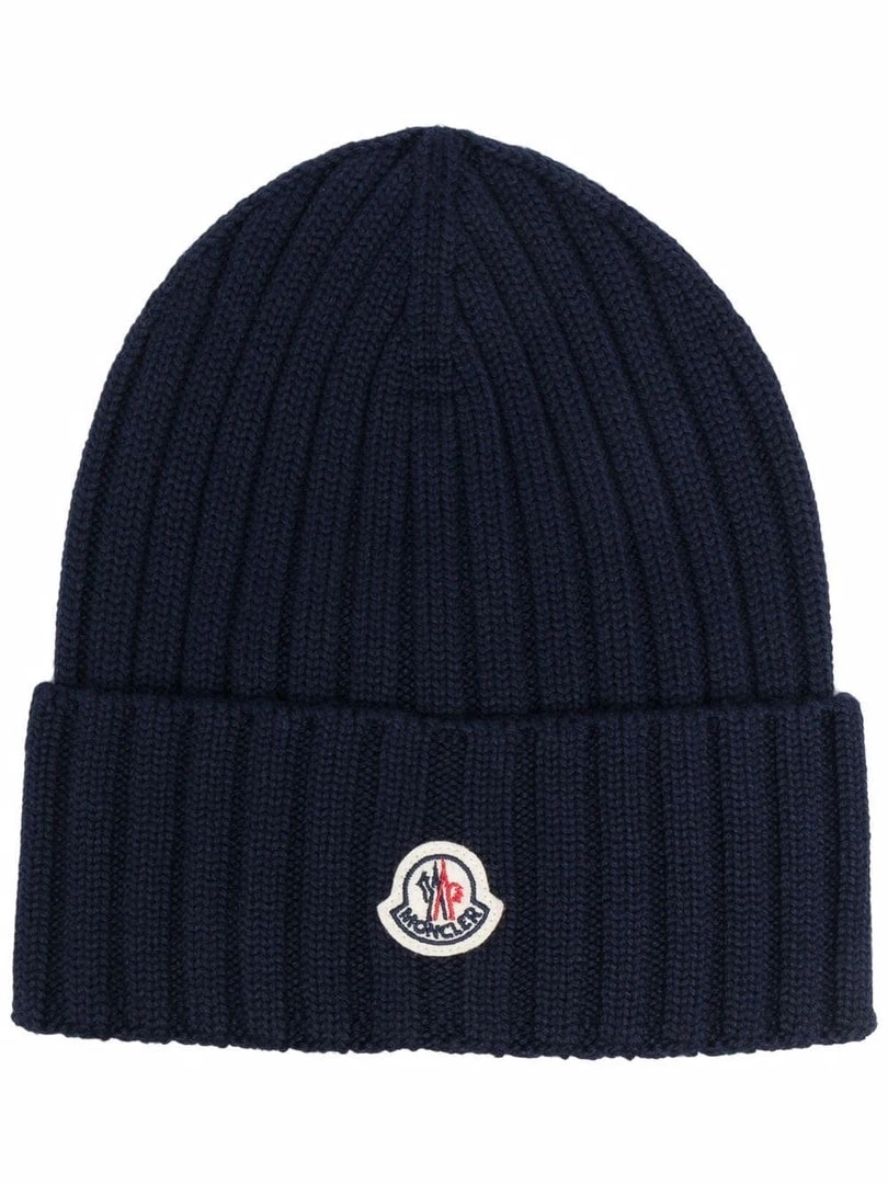Moncler navy ‘Ribbed Logo Beanie Hat’ featuring a front signature logo patch, a ribbed design, a turned up hem and pulls on. Made in Moldova. One Size.