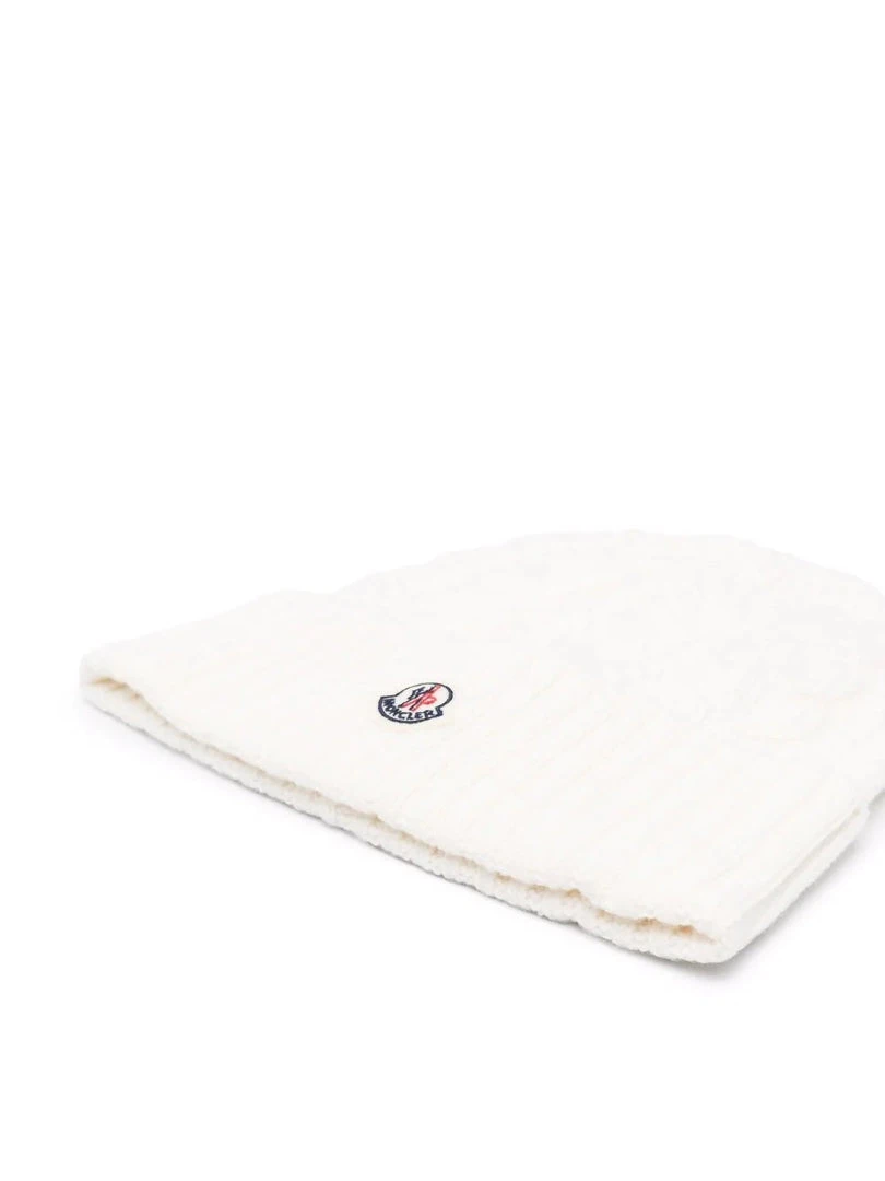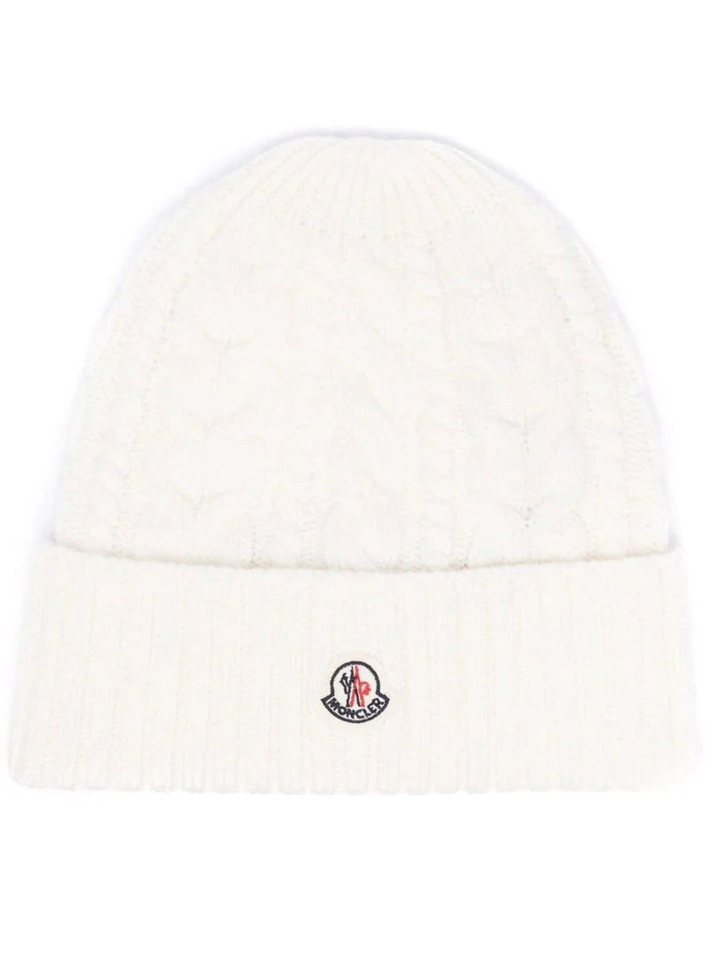 Moncler white ‘Logo-Patch Knitted Beanie’ featuring a rolled up hem, a front logo patch, a cable knit design and pulls on. One Size.Â