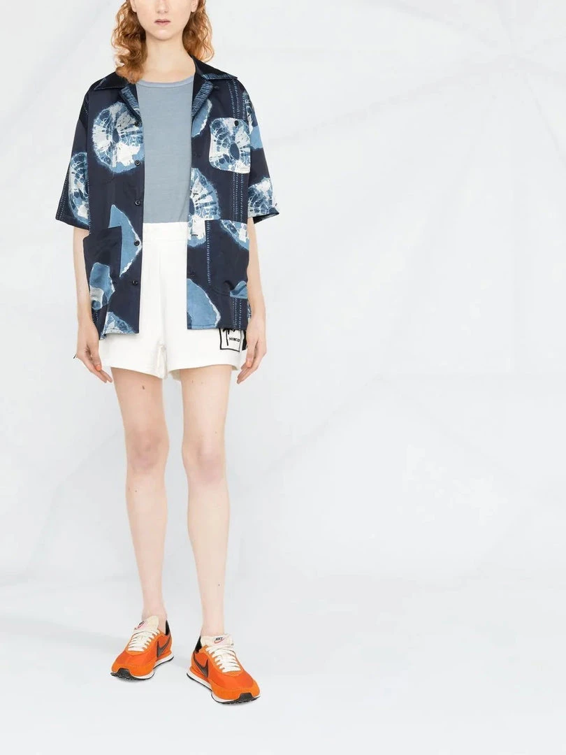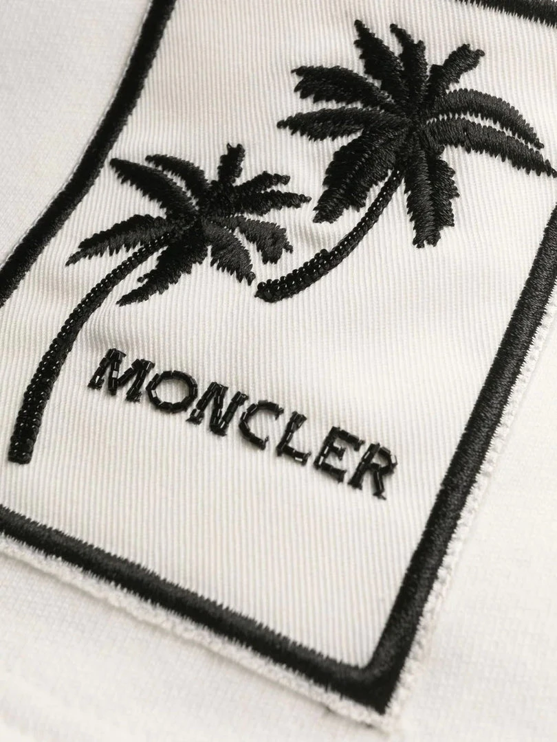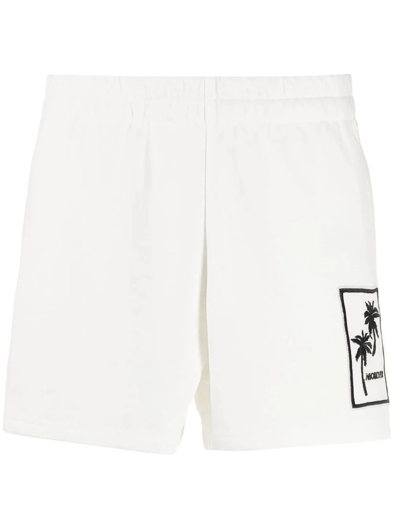 Moncler white ‘Palm Tree Detail Shorts’ featuring an inner drawstring waist, side slip pockets, a logo and palm tree patch to the front and pulls on. Item fits true to size. Model is wearing a size XS.