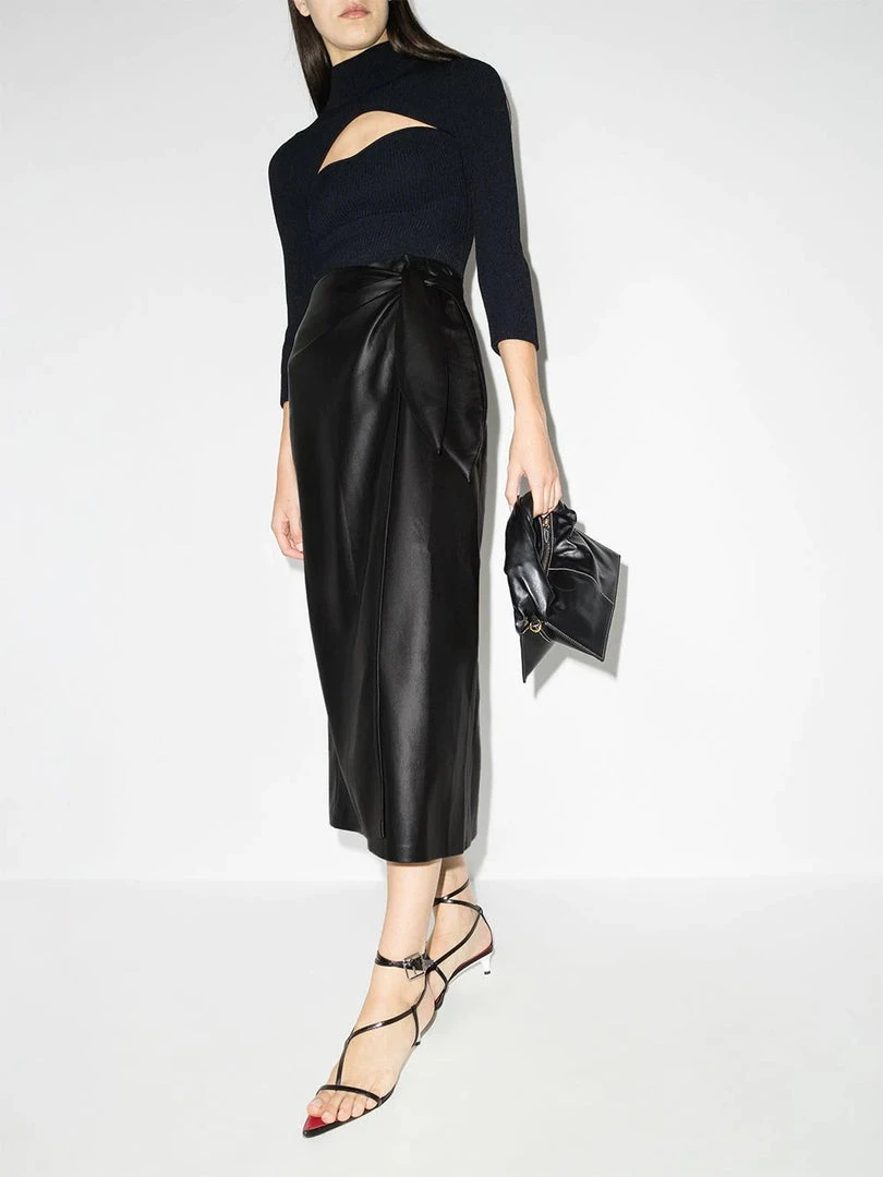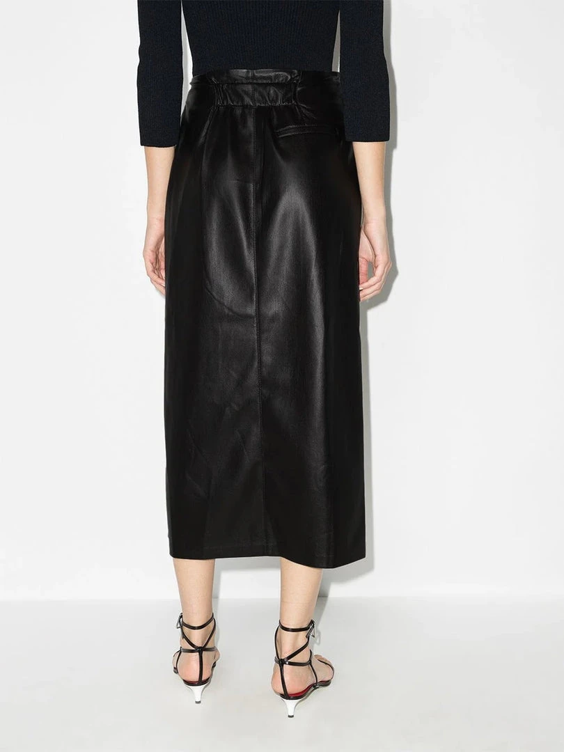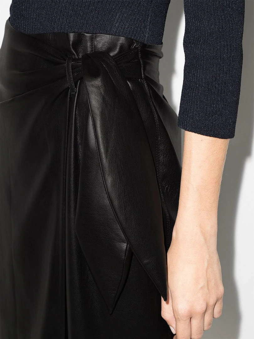 Nanushka black ‘Amas’ vegan leather midi skirt featuring a wrap around style with a front tie fastening, an elasticated back, a high waist fit and a back pocket detail. Item fits true to size. Model is wearing a size S.