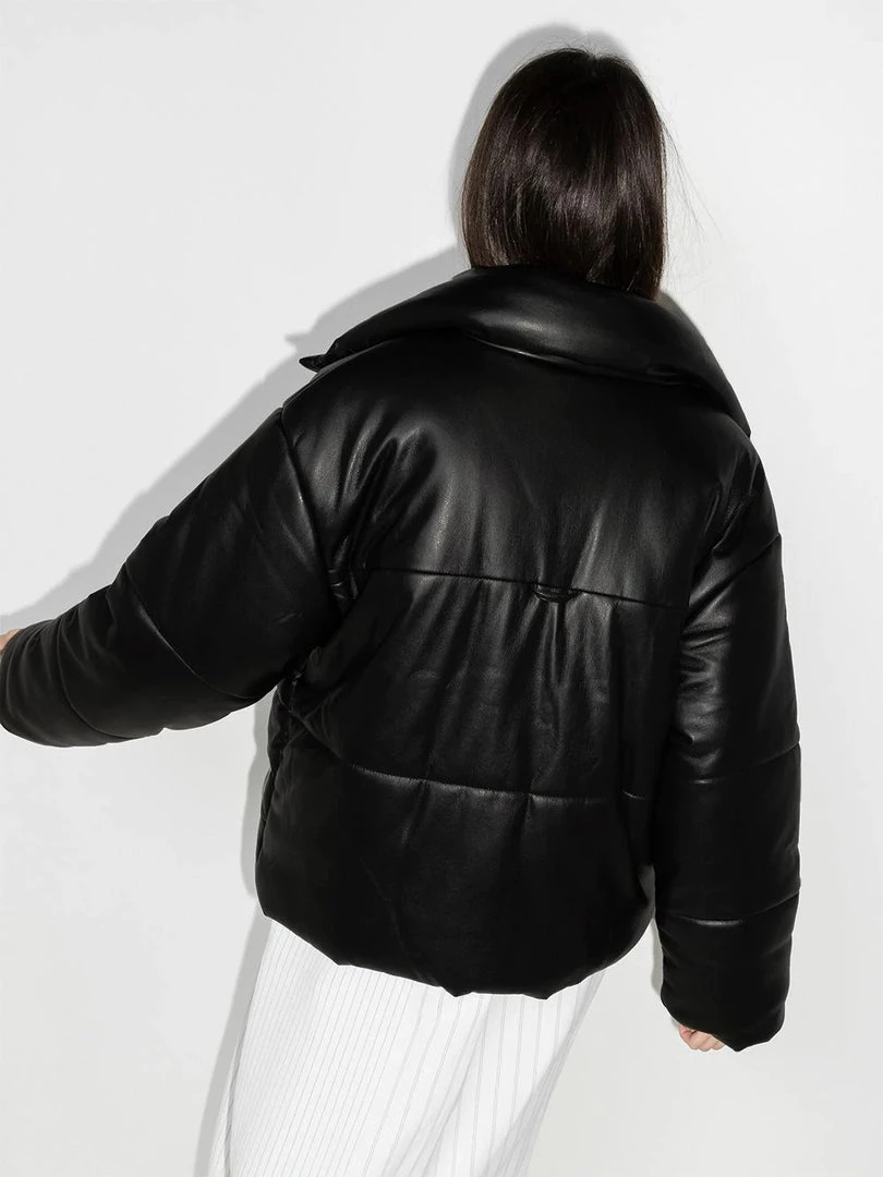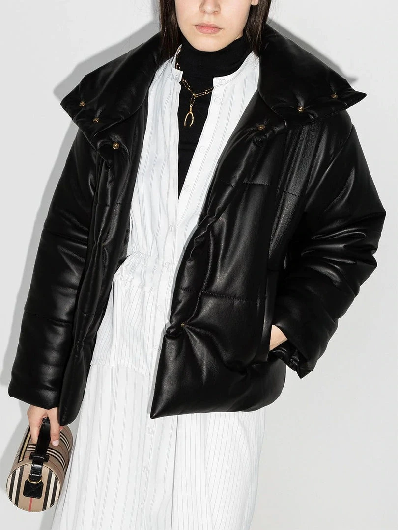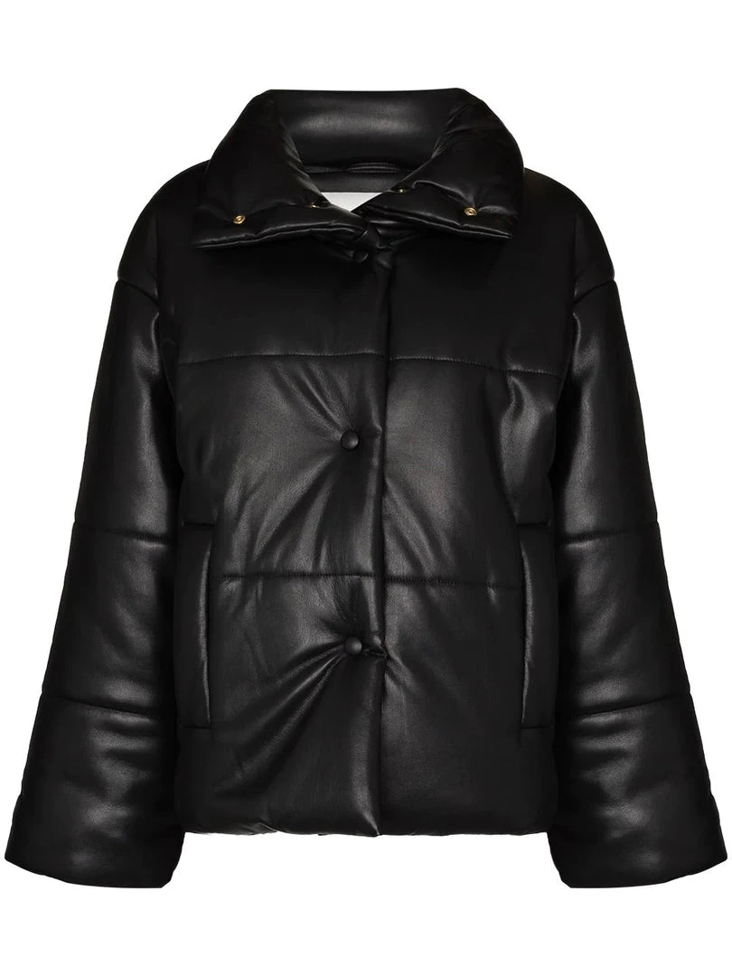 Nanushka black oversized ‘Hide’ vegan leather puffer jacket featuring a high neck, front button fastenings, long sleeves, stitched panels, side slip pockets and a padded design. Model is wearing a size S.