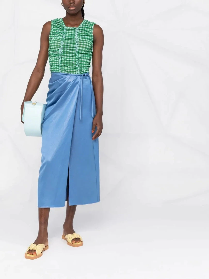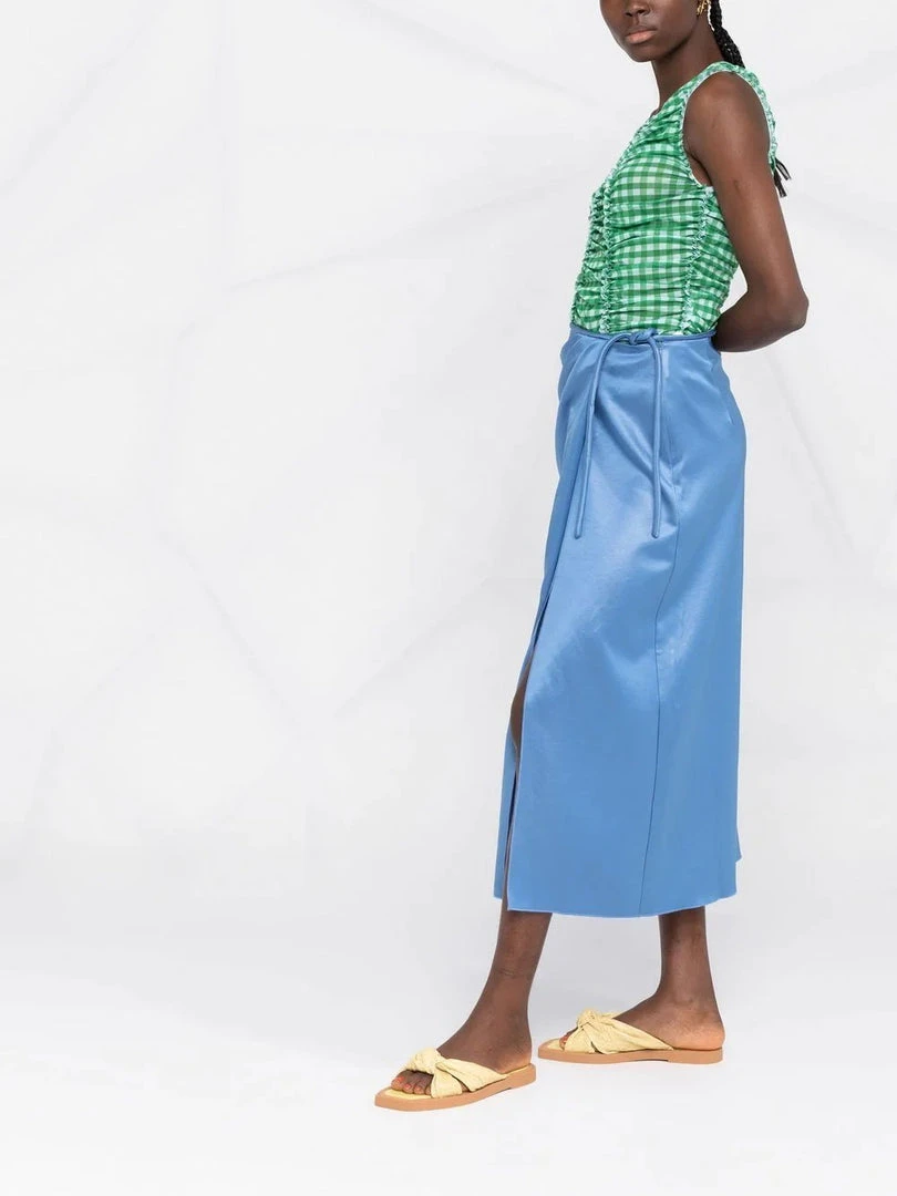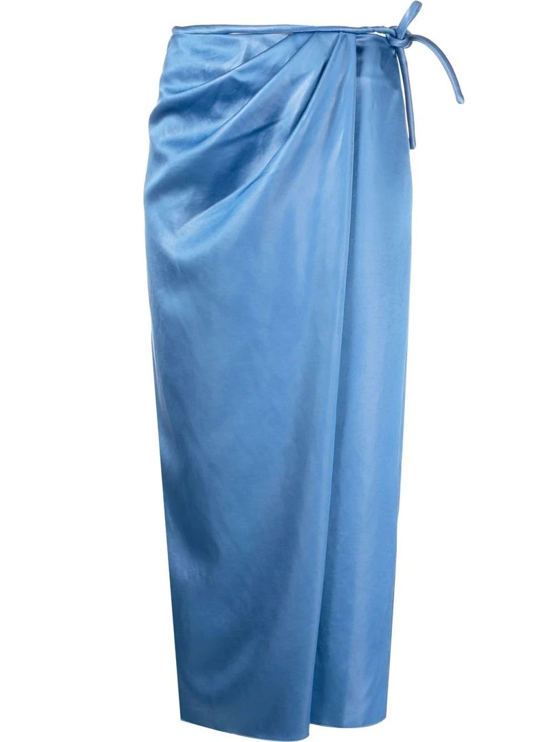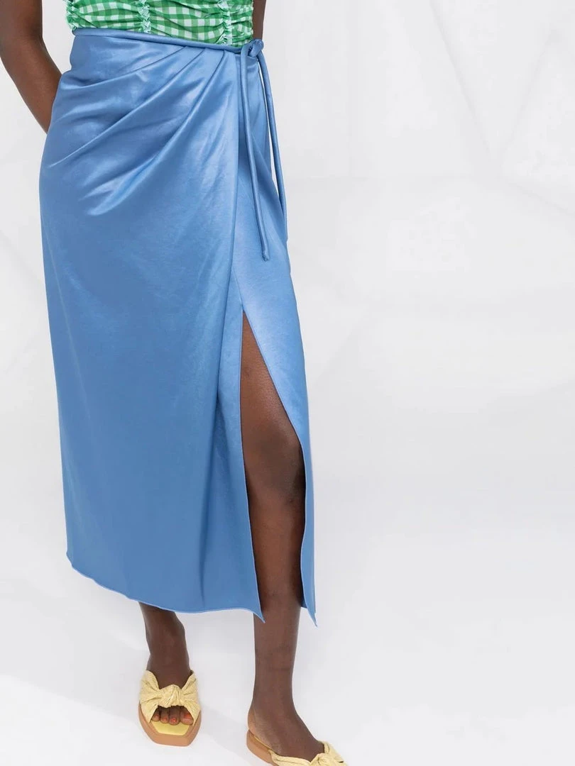 Nanushka blue ‘Lea’ skirt featuring a side tie fastening, front pleat detailing, a side slit, a wrap style and a midi length. Item fits true to size. Model is wearing a size S.