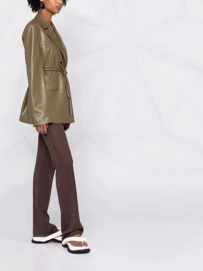 Nanushka olive green ‘Mariko’ vegan leather blazer featuring lapels, front button fastenings, a belted tie waist, belt loops, long sleeves with buttoned cuffs, a front three pocket design and a back slit. Item fits true to size. Model is wearing a size S.Â
