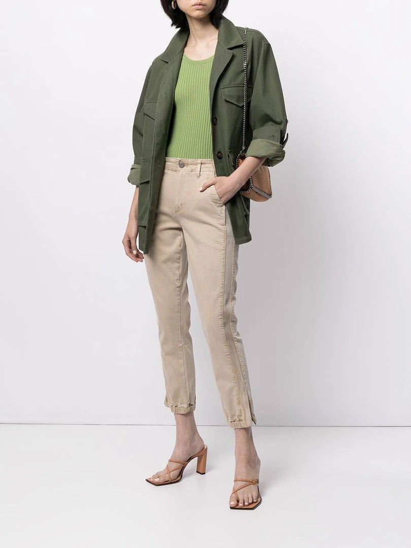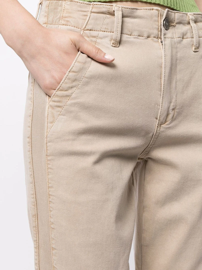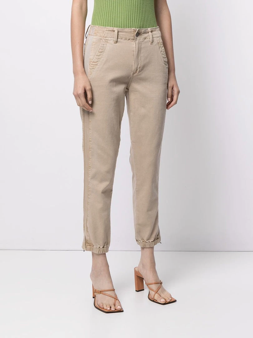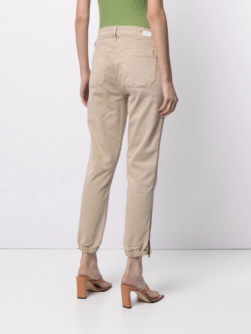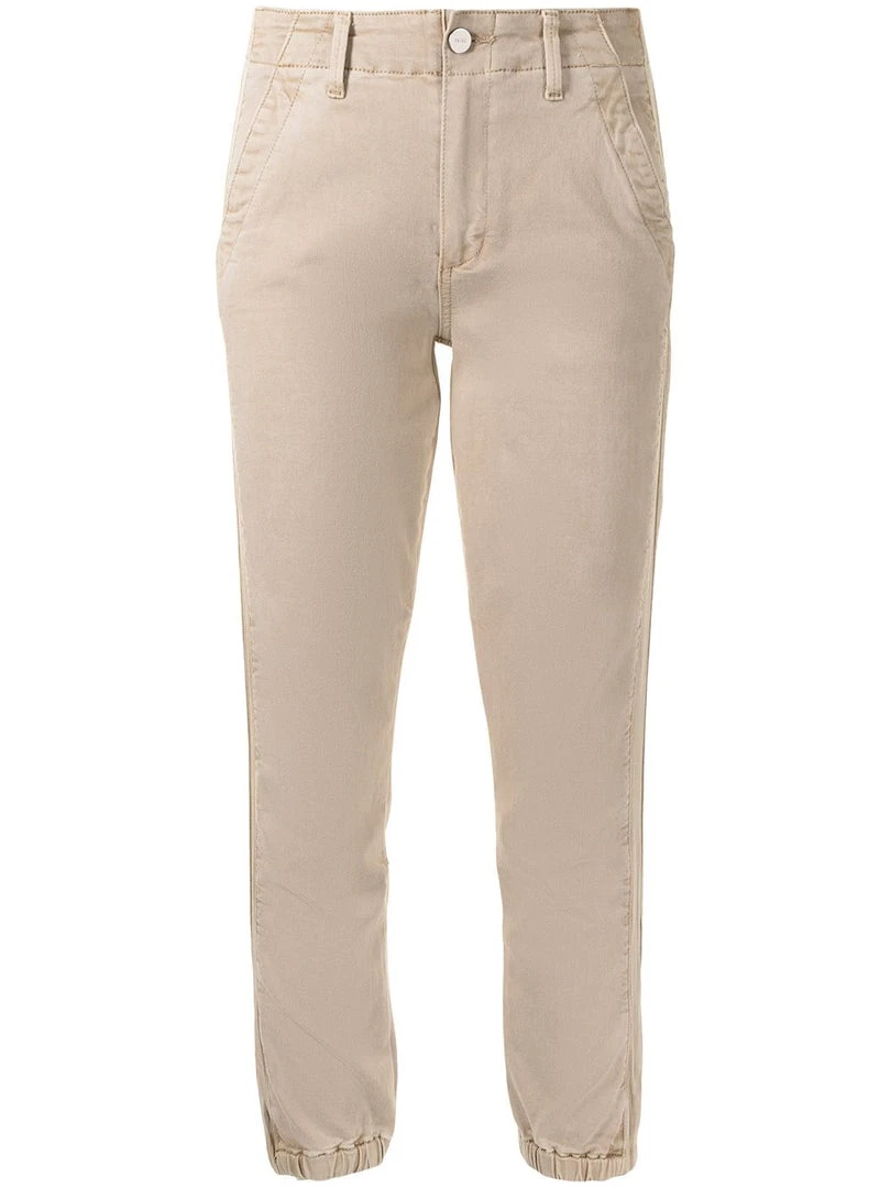 PAIGE beige ‘Mayslie’ denim joggers featuring a front button and zip fastening, belt loops, a four pocket design, a fabric stripe design going down the leg seam, a straight leg fit, elasticated ankle cuffs and zipped ankle details. Item fits true to size. Model is wearing a size 27W.