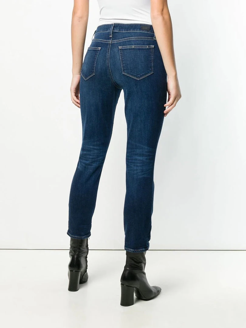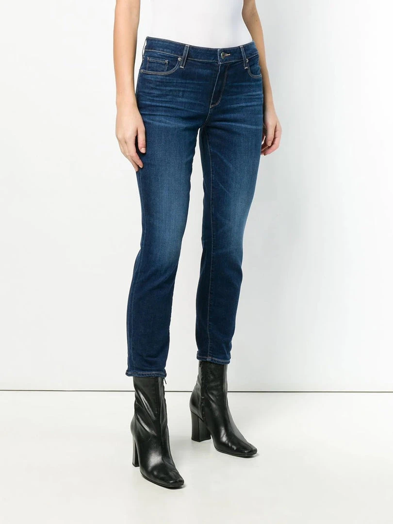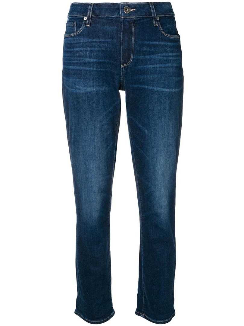 Paige blue ‘Brigitte’ boyfriend skinny jeans featuring belt loops, a front button and zip fastening, a five-pocket design, a skinny leg fit and a dark denim wash. Item fits true to size. Model is wearing a size 27W.