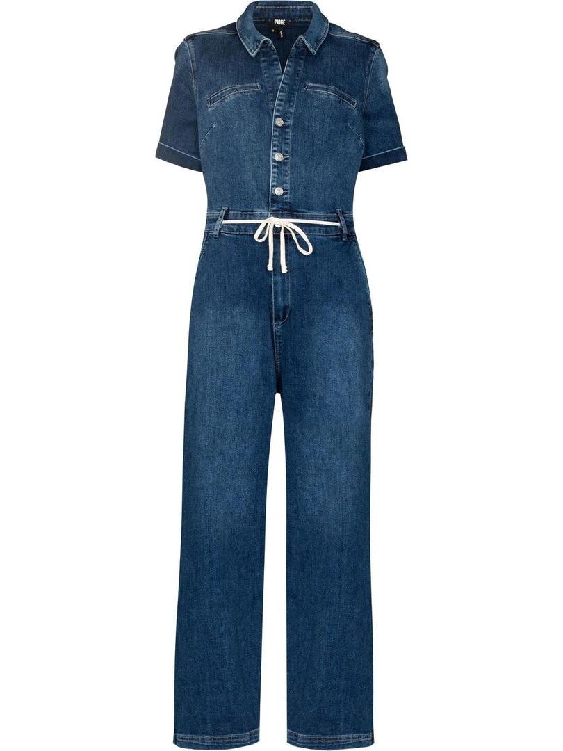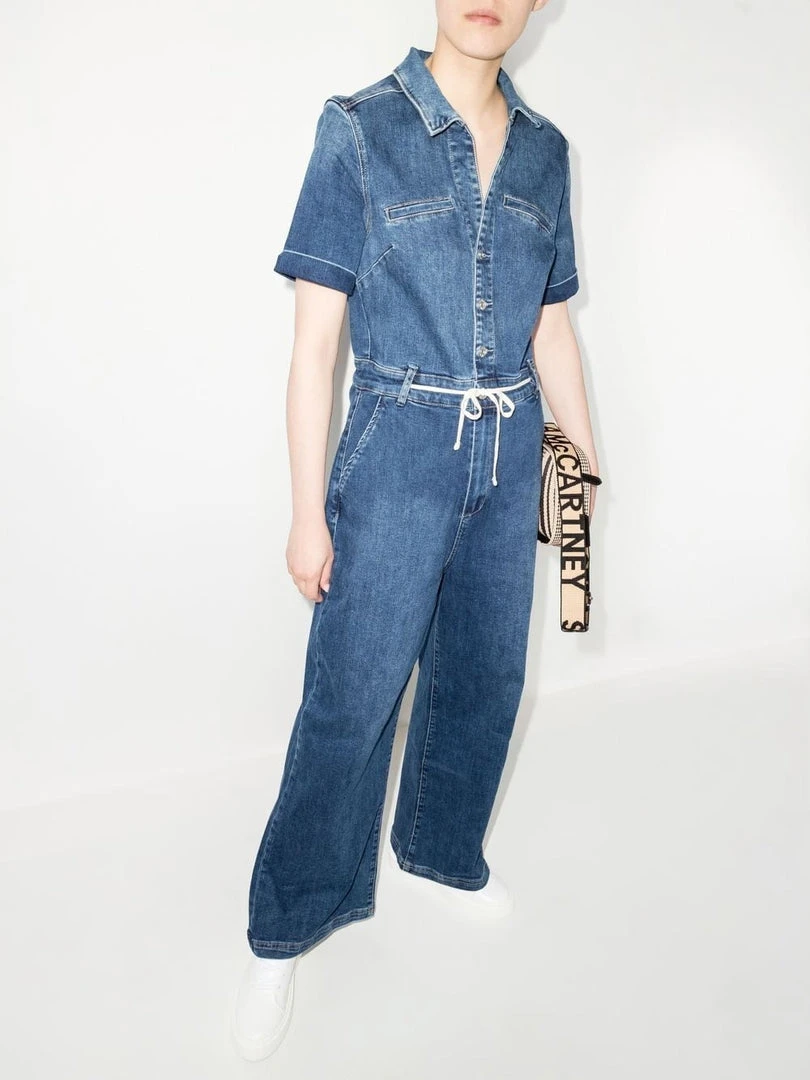 Paige ‘Carly’ blue denim jumpsuit featuring a collared neckline, front button and zip fastenings, short sleeves with a turned up hem, front chest pocket detailing, side slip pockets, back patch pockets, belt loops, a drawstring waist and a wide leg fit. Item fits true to size. Model is wearing a size 4 US.