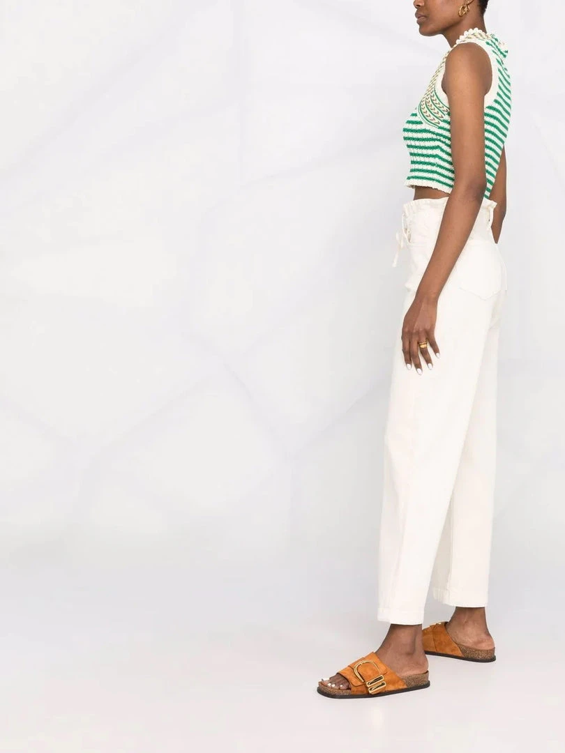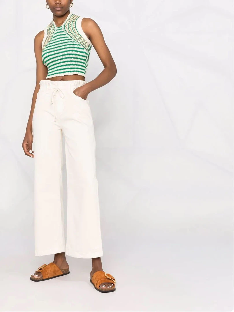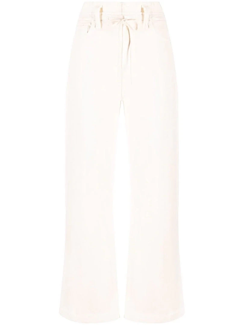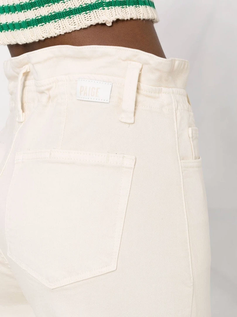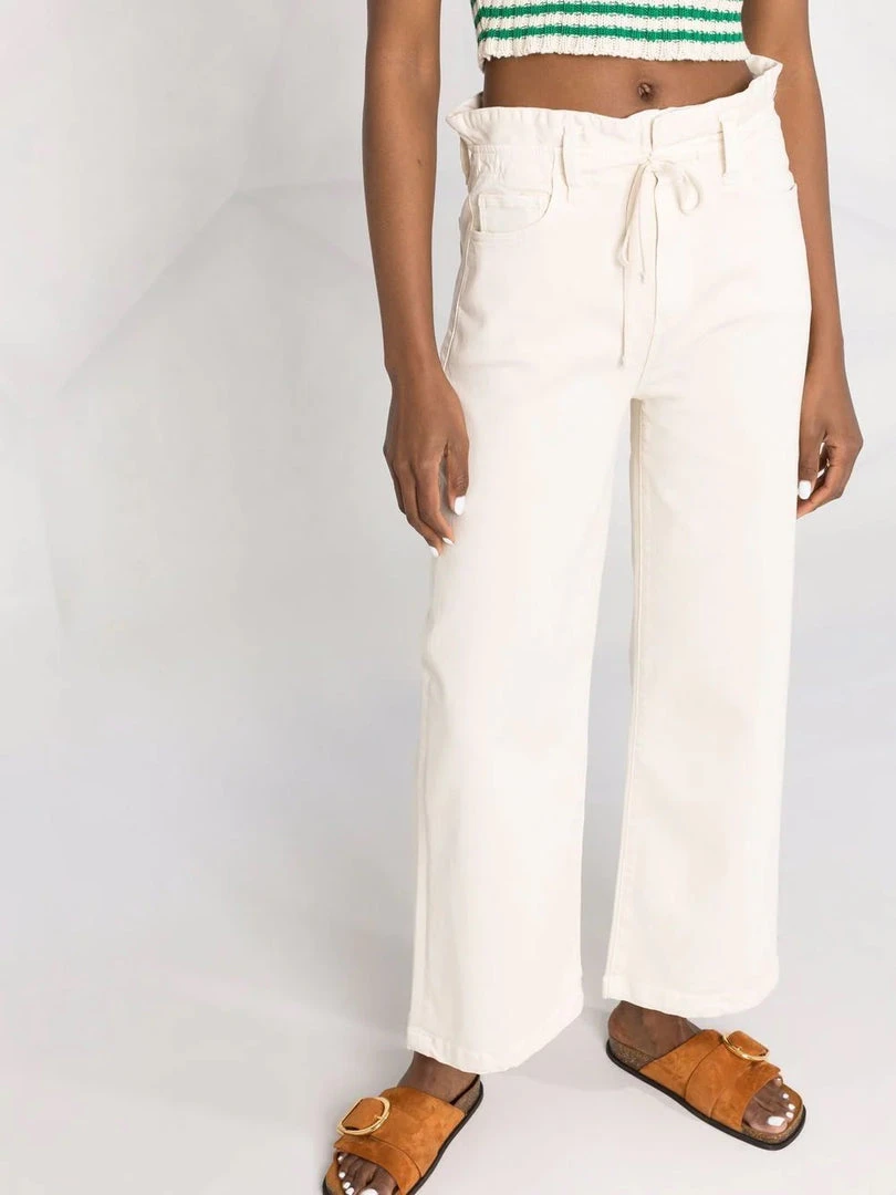 Paige ecru ‘Carly’ wide leg jeans featuring a drawstring waistband tie detail, belt loops, a front zip fastening, a five pocket design, a wide leg fit and a high rise style. Item fits true to size. Model is wearing a size 27 W.Â
