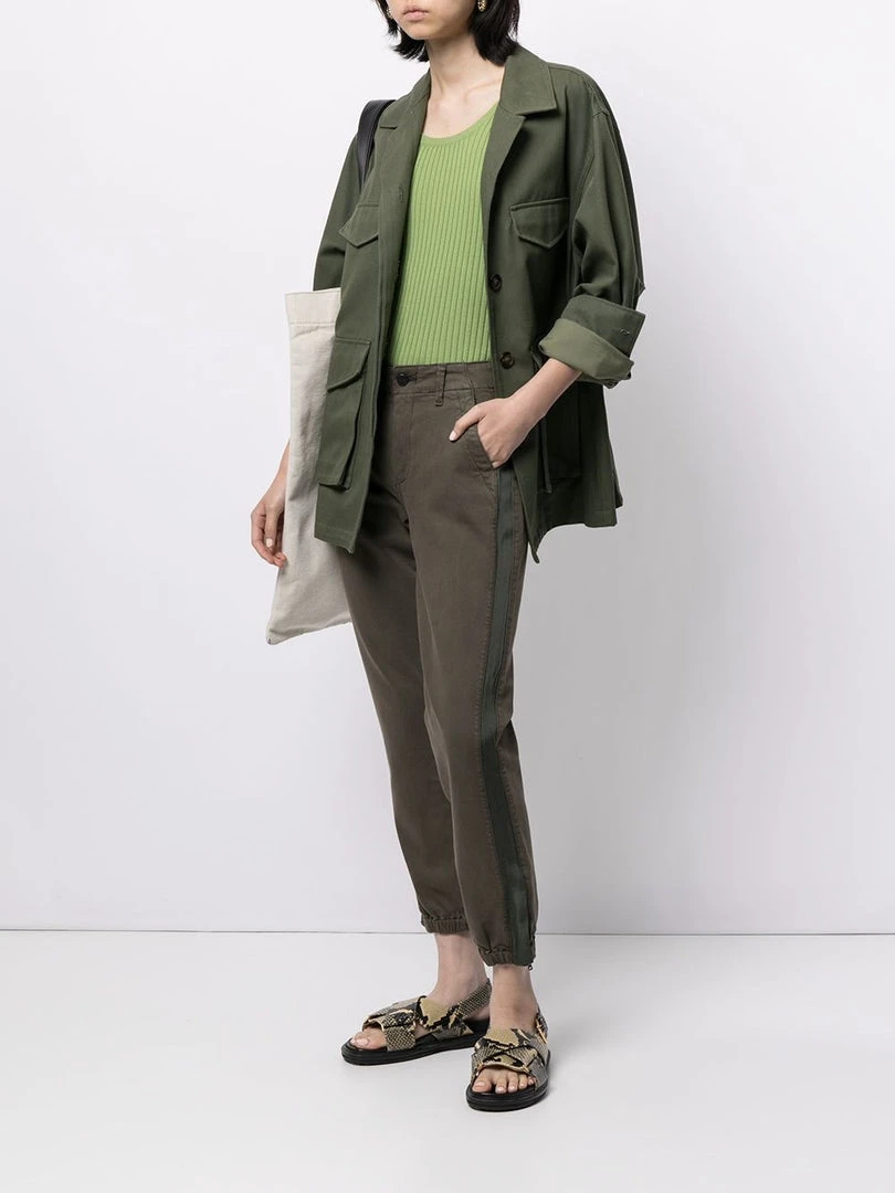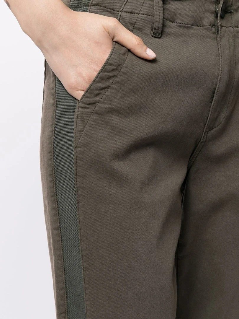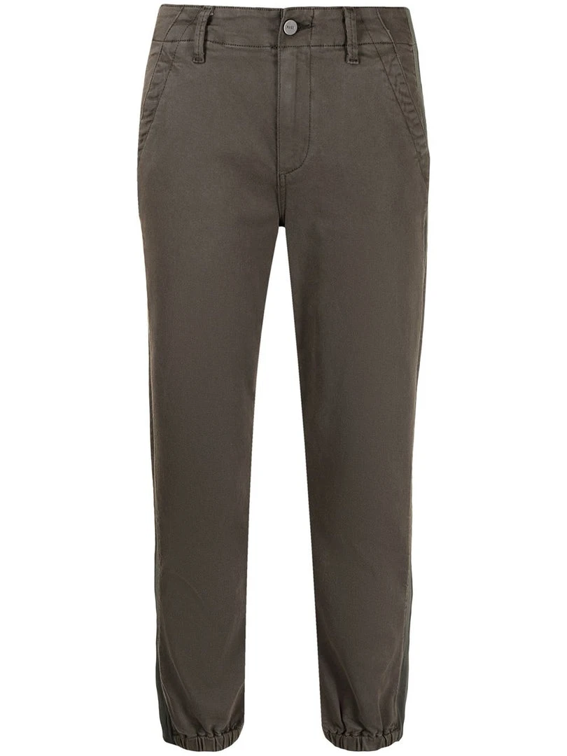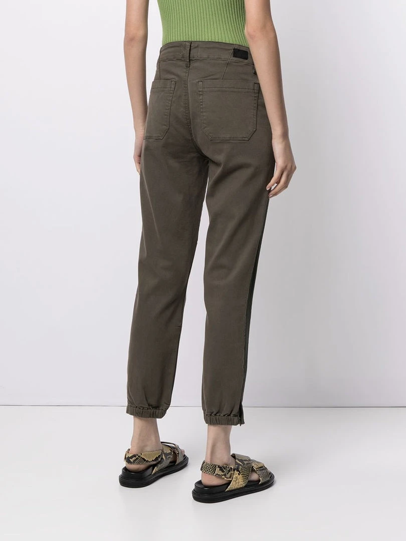PAIGE khaki ‘Mayslie’ denim joggers featuring a front button and zip fastening, belt loops, a four pocket design, a fabric stripe design going down the leg seam, a straight leg fit, elasticated ankle cuffs and zipped ankle details. Item fits true to size. Model is wearing a size 27W.