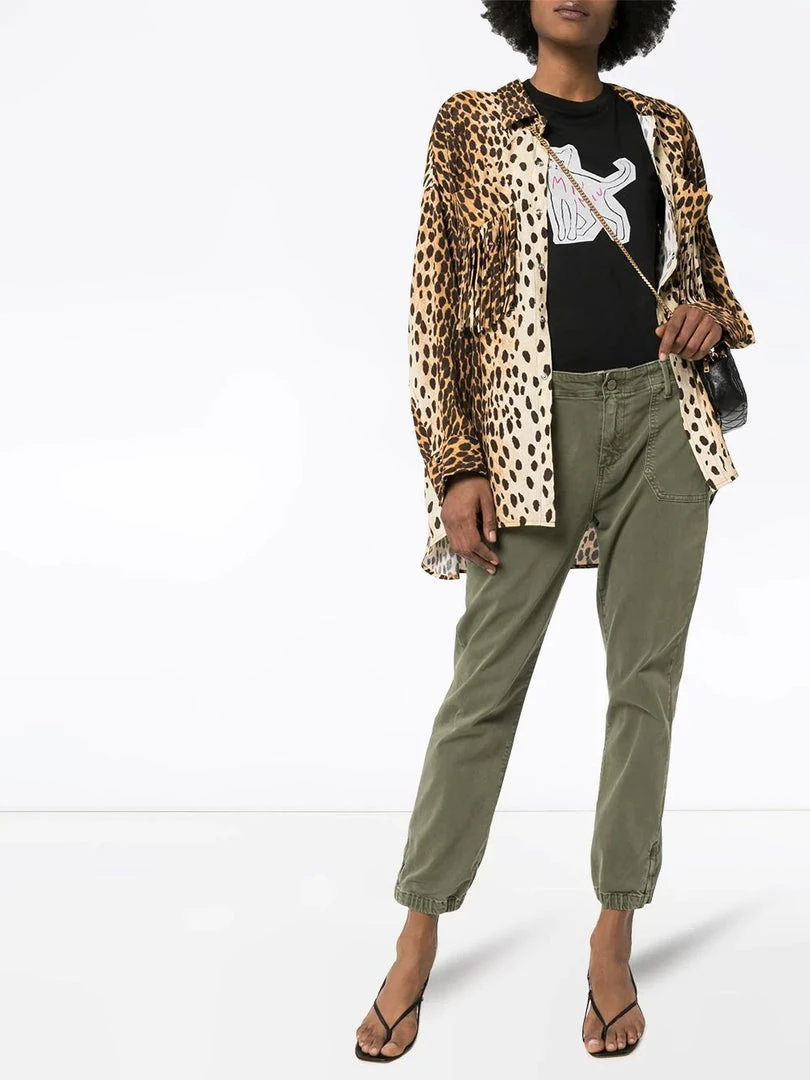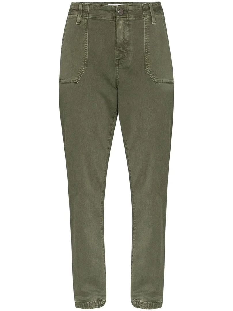 Paige ‘Mayslie’ denim cargo jeans featuring a front button and zip fastening, belt loops, a four pocket design, a straight leg, zipped leg cuffs, elasticated ankles, a cropped style and a khaki denim wash. Item fits true to size. Model is wearing a size 27W.