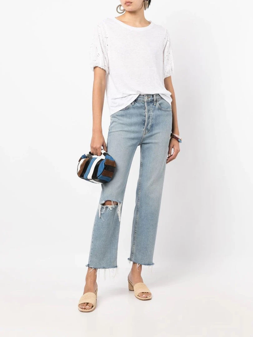 Paige white ‘Laura’ top featuring a round neckline, short lace puff sleeves with elasticated cuffs, a straight hem and pulls on. Item fits true to size. Model is wearing a size XS.