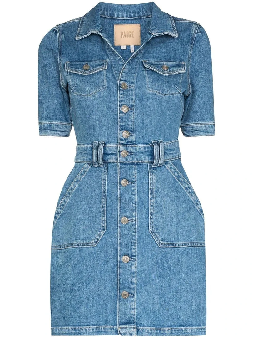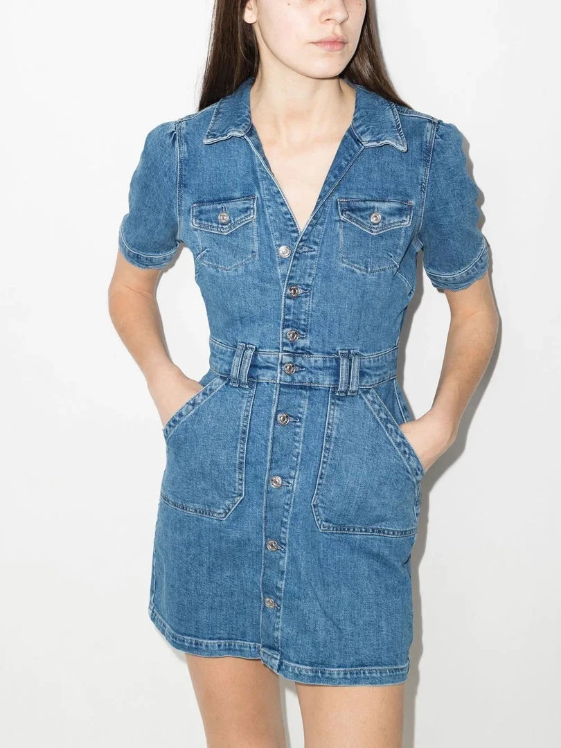 Paige blue ‘Mayslie’ denim mini dress featuring a collared neckline, front button fastenings, short sleeves with buttoned cuffs, belt loops and a six pocket design. Item fits true to size. Model is wearing a size S.