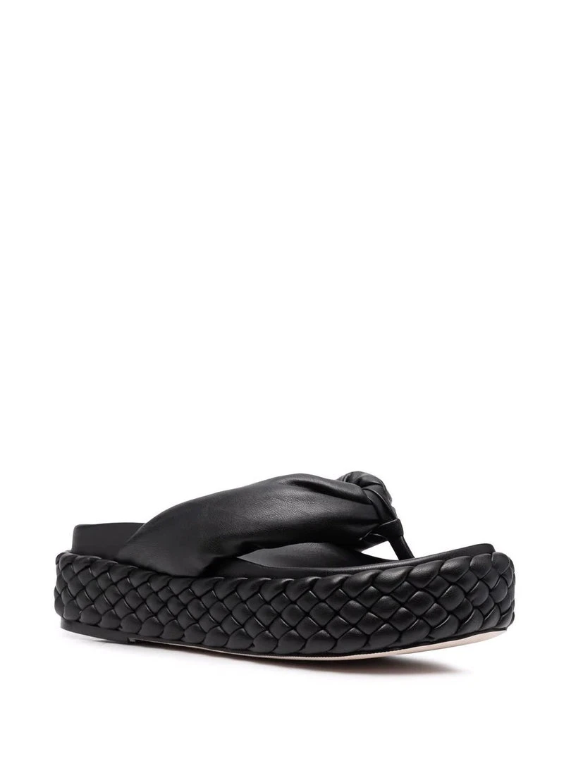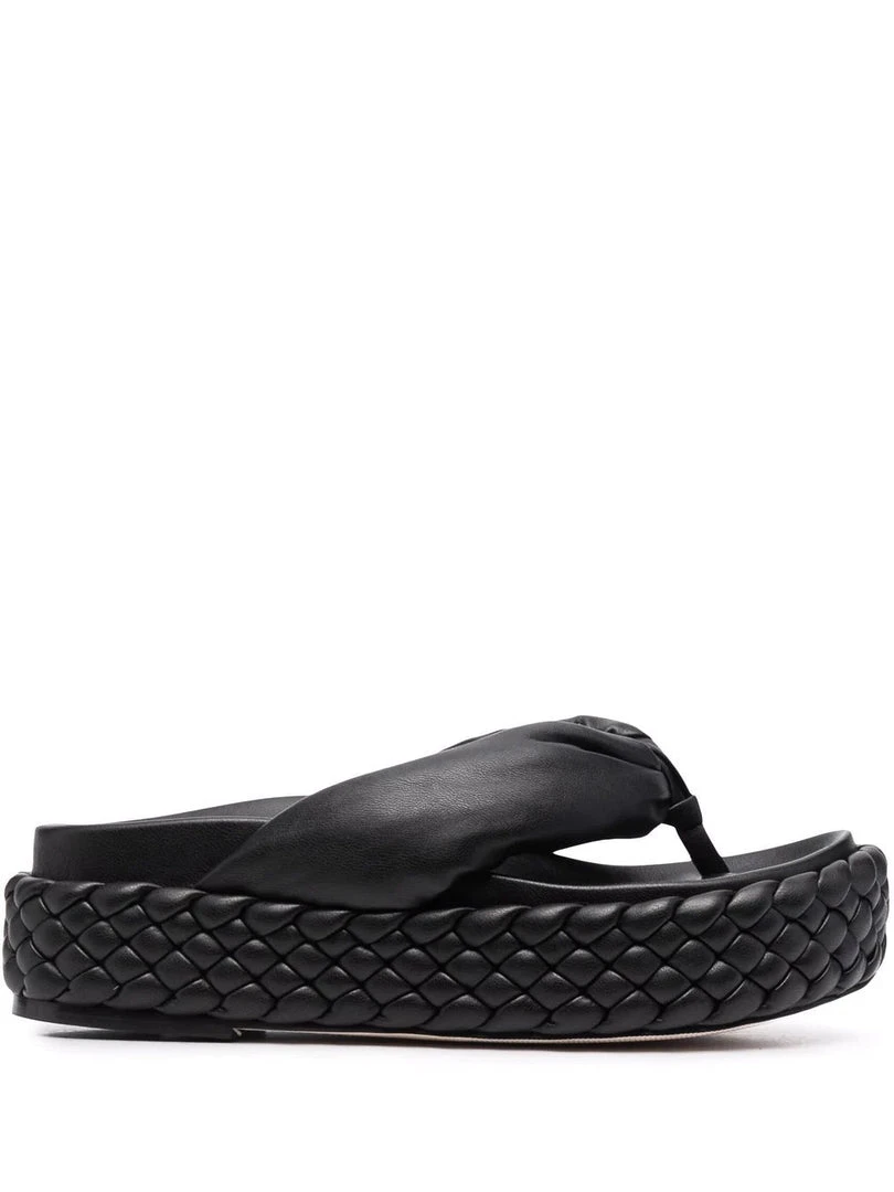 Paloma Barcelo black ‘Henry’ platform flip flops featuring a thong toe, a branded insole, a braided sole and a slip-on style. Made in Spain. Item fits true to size. Italian Sizing.