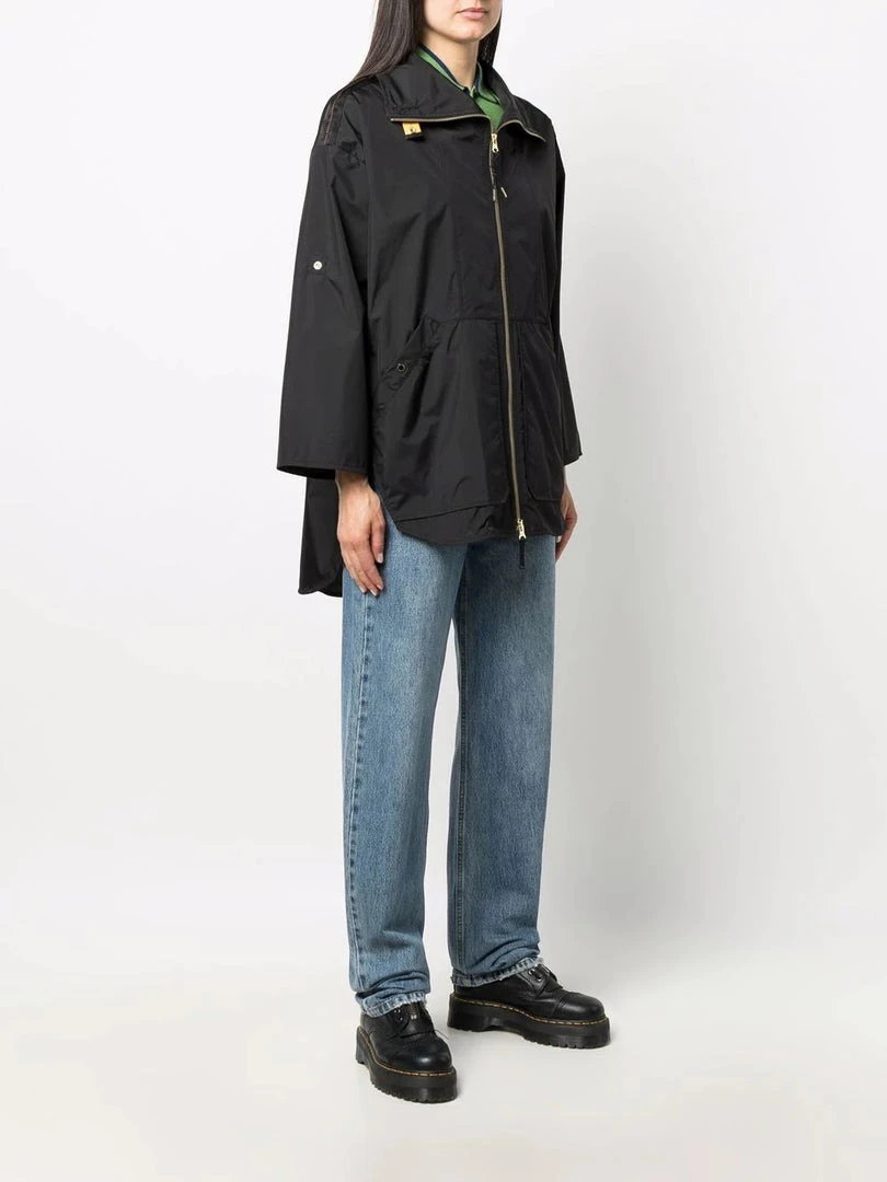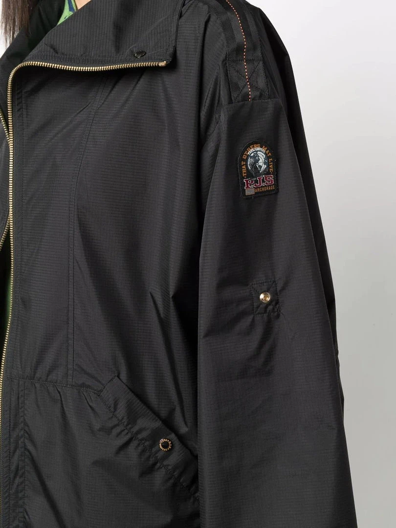 Parajumpers black ‘Hannah’ water repellent shacket featuring a high neckline with a snap button detail, a two way front zip fastening, dropped shoulders, half to long sleeves with snap button adjustments, a brand logo embroidered patch on the shoulder, a drawstring waist, side slip pockets with snap button closures, side slits and a high-low hemline. Fabric has been treated to be water repellent. Item is slightly oversized. Model is wearing a size S.Â