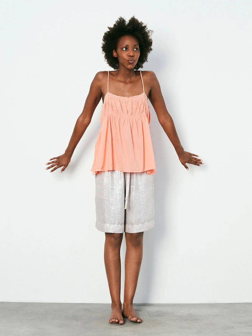 Rabens Saloner coral pink ‘Hailey’ gathered top featuring spaghetti straps, a straight neckline, a pleated top design, a frayed top hemline, a boxy fit and pulls on. Item fits true to size.
