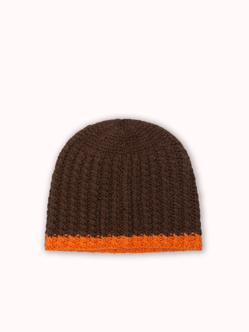 Resume brown ‘Hand Knitted Beanie’ featuring a cable knit design, a contrasting orange rim and a pull on style. Item is One Size. Made in China.