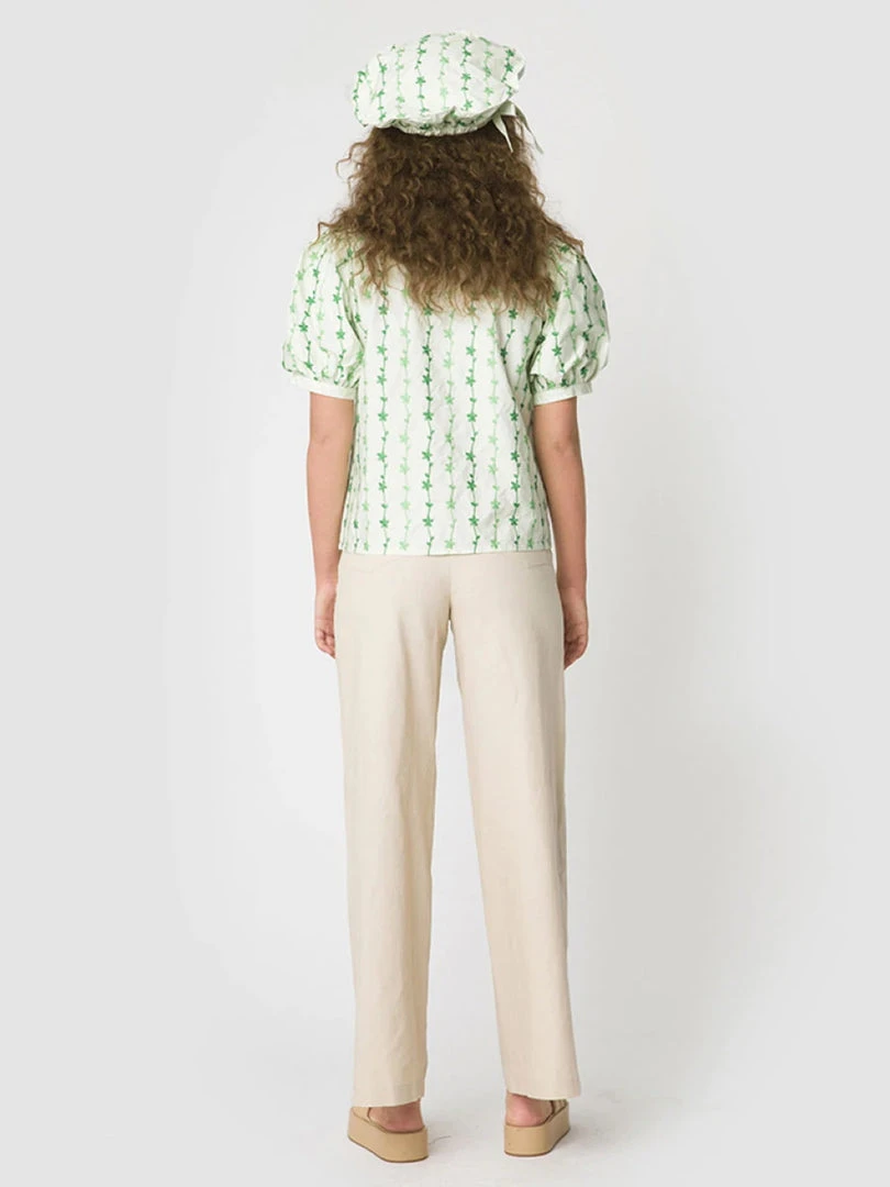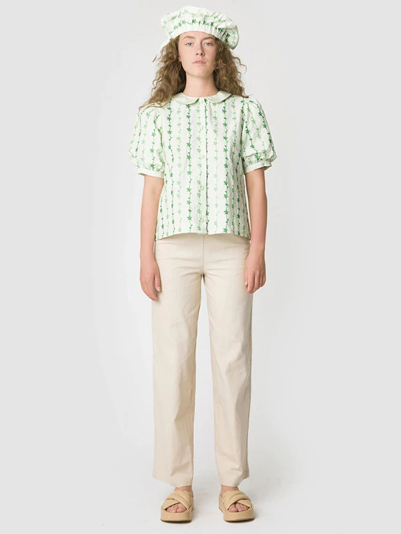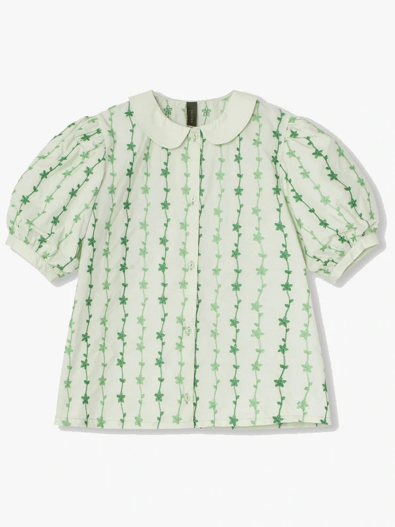 Resume green ‘LeanneRS Blouse’ featuring a curved collar, short puff sleeves, front button fastenings and a green toned floral embroidered design. Item fits true to size. Model is wearing a size 36 DE/DK.