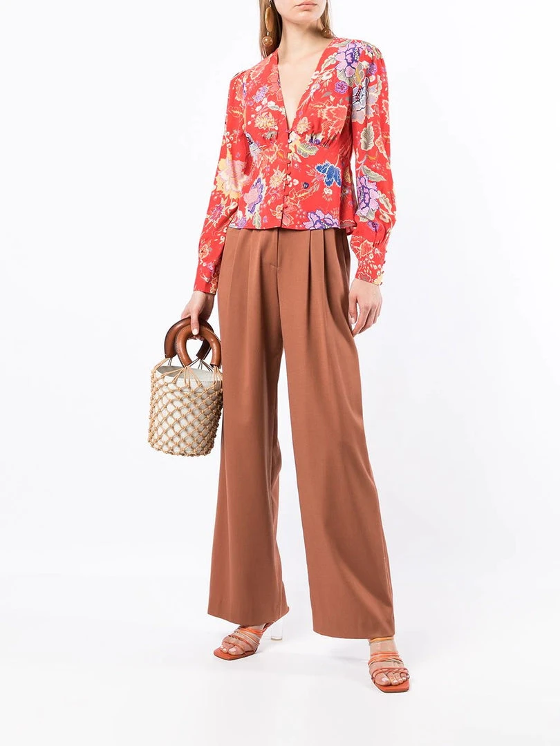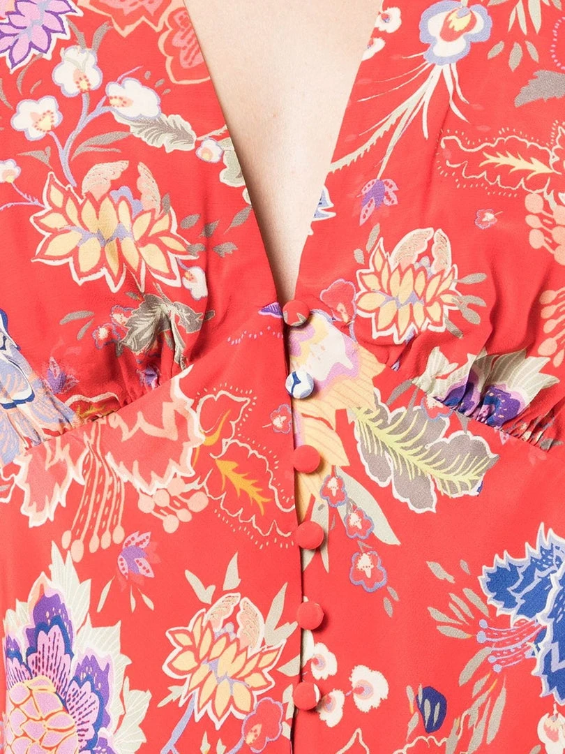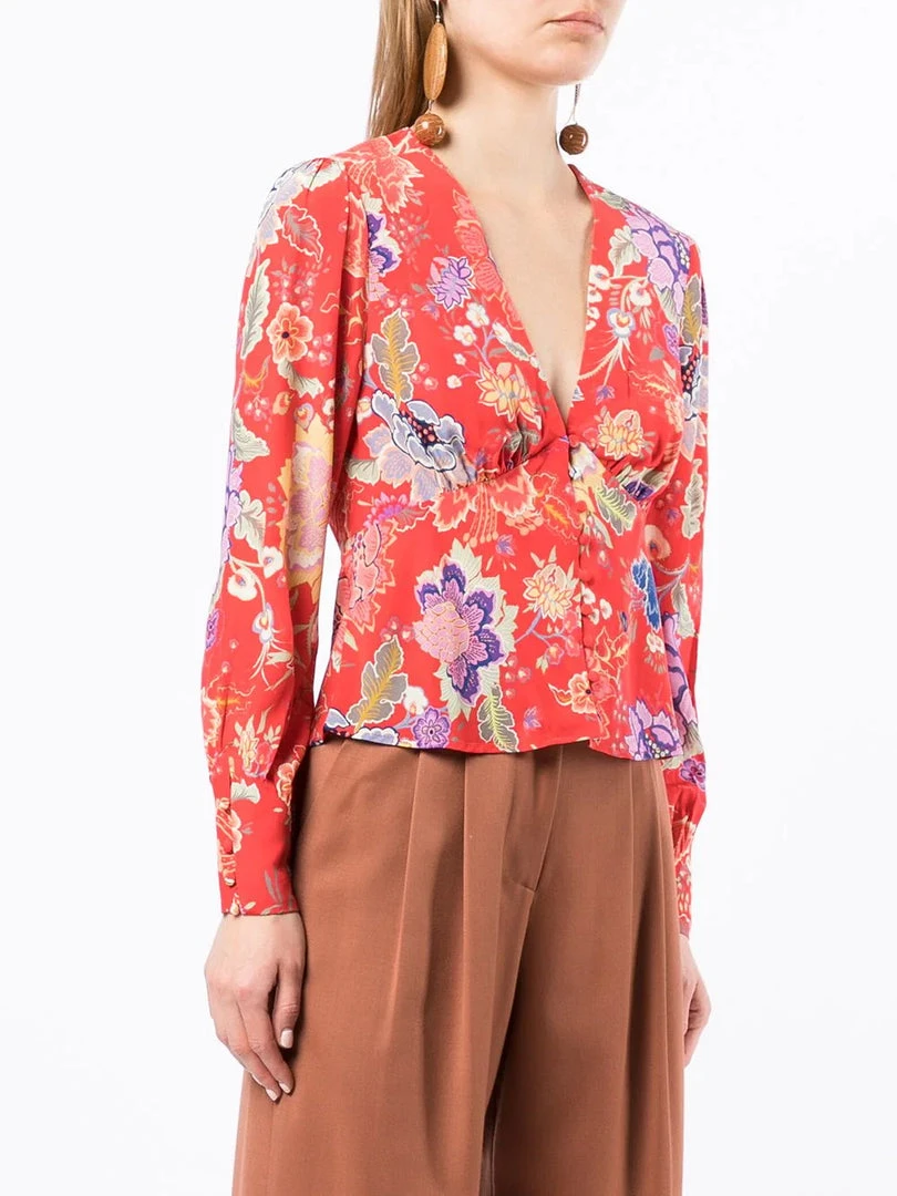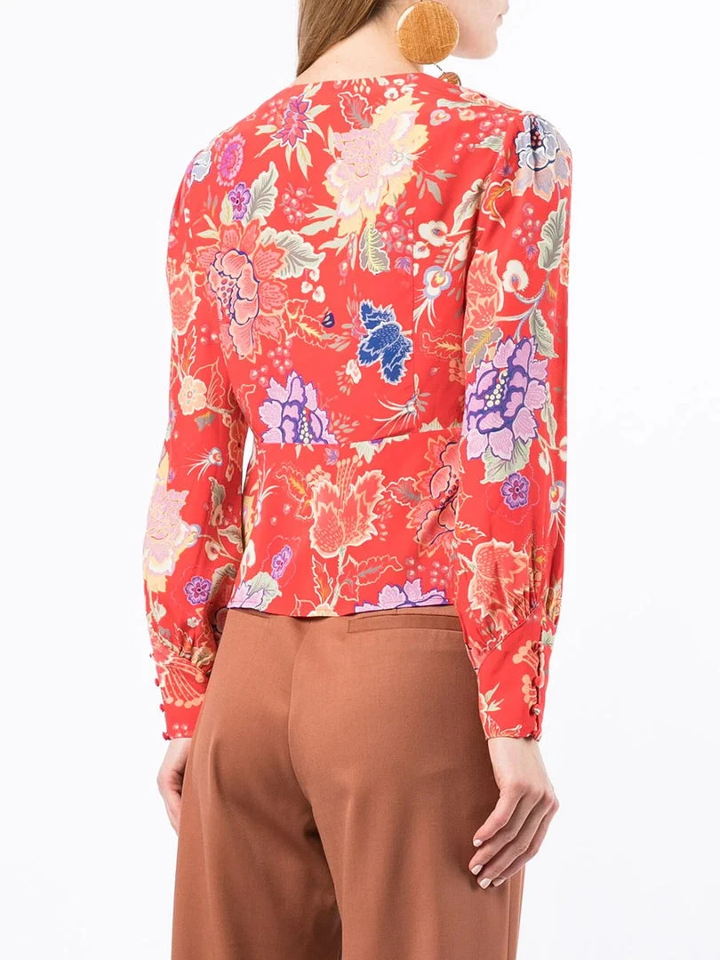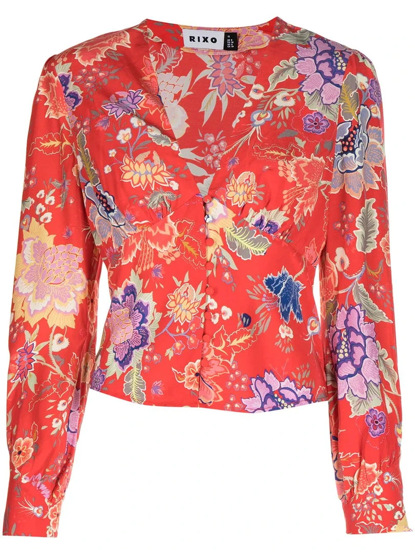 Rixo coral red ‘Azra’ button front floral blouse featuring a V-neckline, long sleeves with buttoned cuffs, front button details, a side zip fastening and a multicoloured peony floral print. Item fits true to size. Model is wearing a size XS.Â