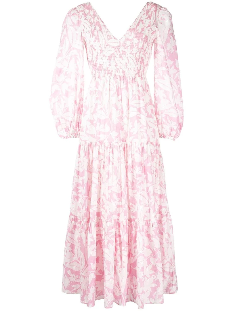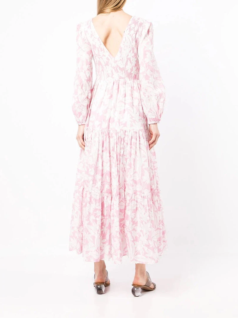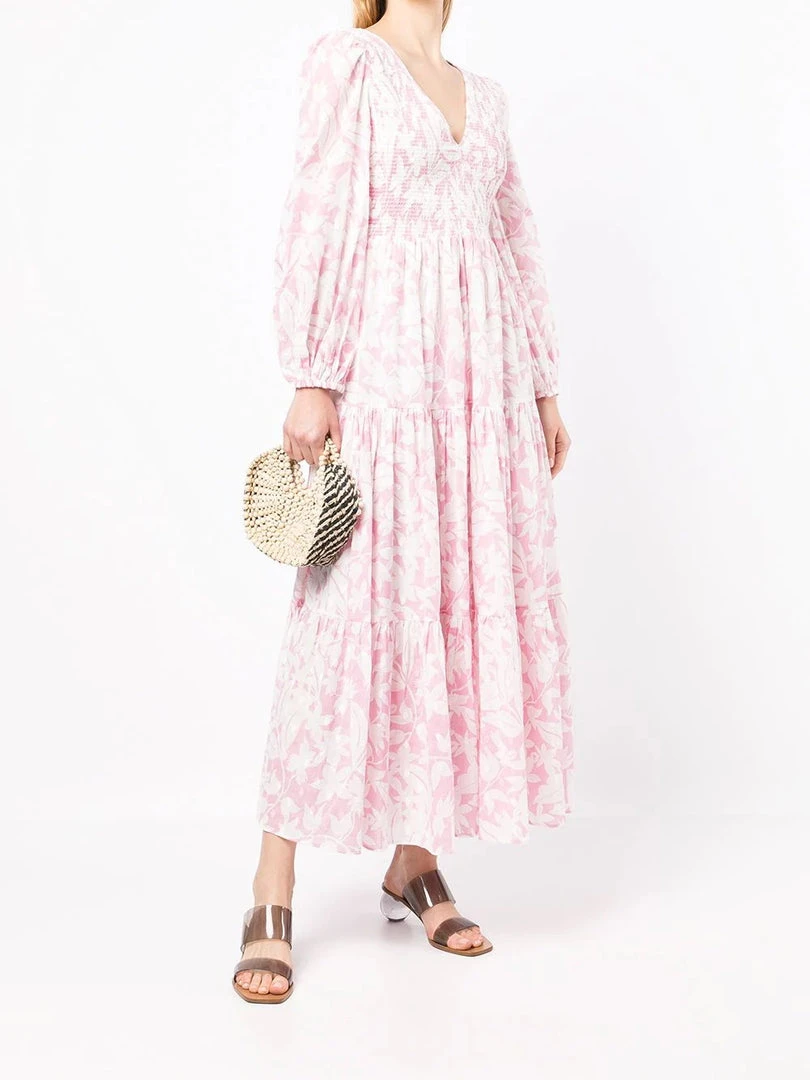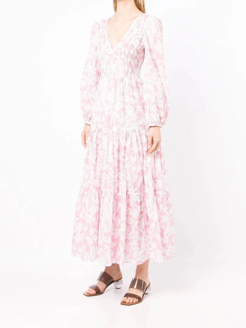 Rixo pink ‘Brooke’ shirred floral palm maxi dress featuring a V-neck and backline, long sleeves with elasticated cuffs, a shirred top, a tiered skirt, a white floral palm print and a long length. Item fits true to size. Model is wearing a size XS.Â