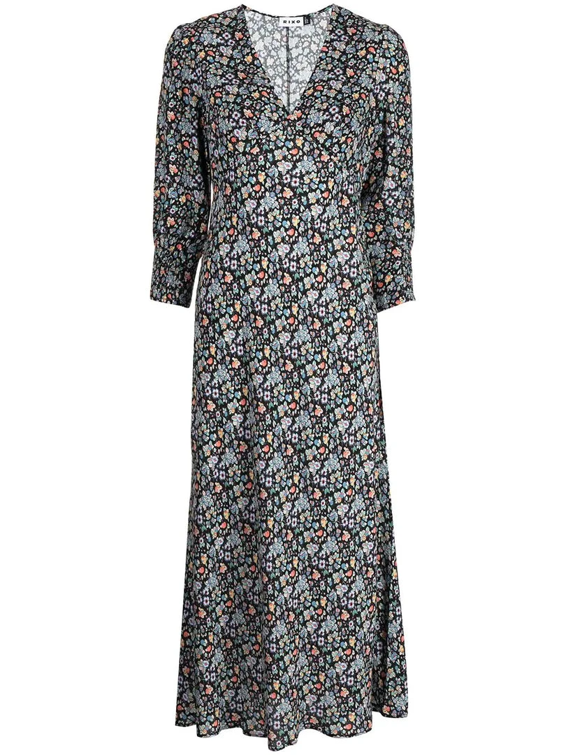 Rixo black ‘Callie’ floral midi dress featuring a V-neckline, half sleeves with elasticated cuffs, an empire waistline, a side zip fastening, a multicoloured floral motif print and a midi length. Item fits true to size. Model is wearing a size XS.Â