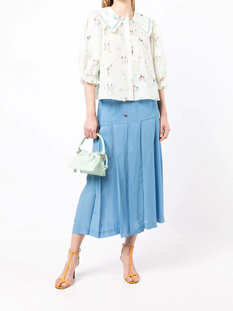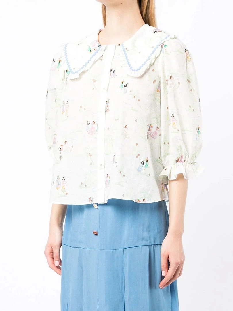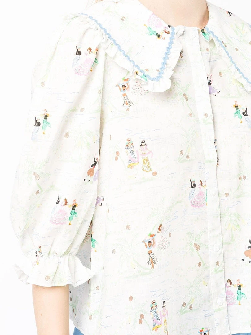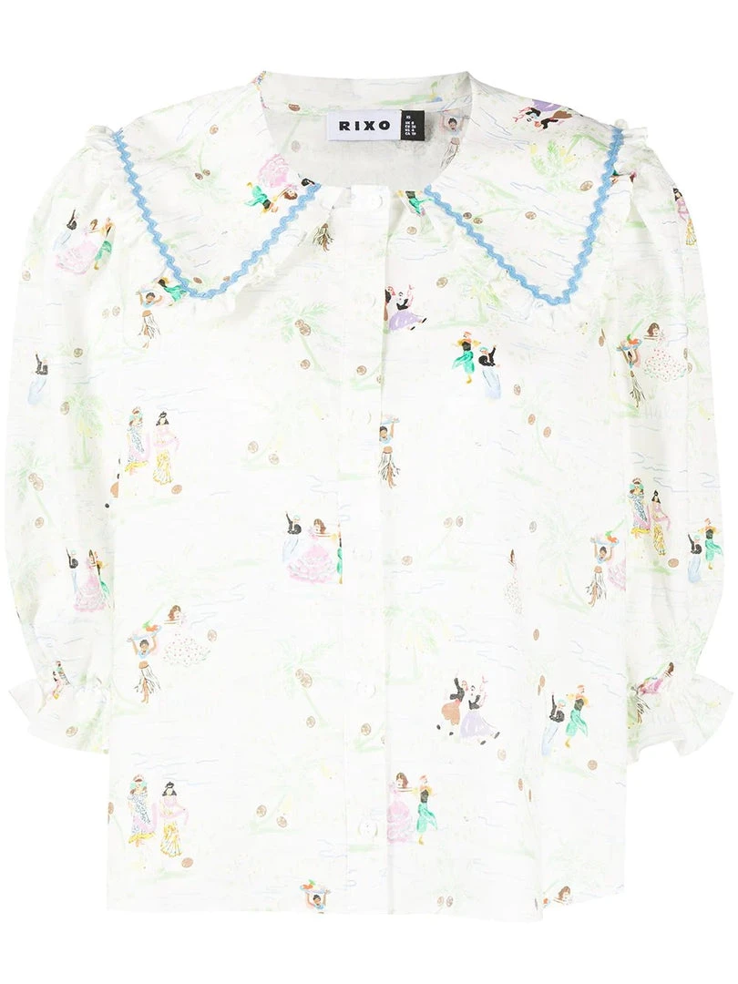 Rixo cream ‘Dallas’ illustrated shirt featuring an oversized ruffled collar, front button fastenings, half sleeves with elasticated cuffs, a multicoloured Mallorca dancing illustration print and blue embroidered trimming. Item fits true to size. Model is wearing a size XS.Â