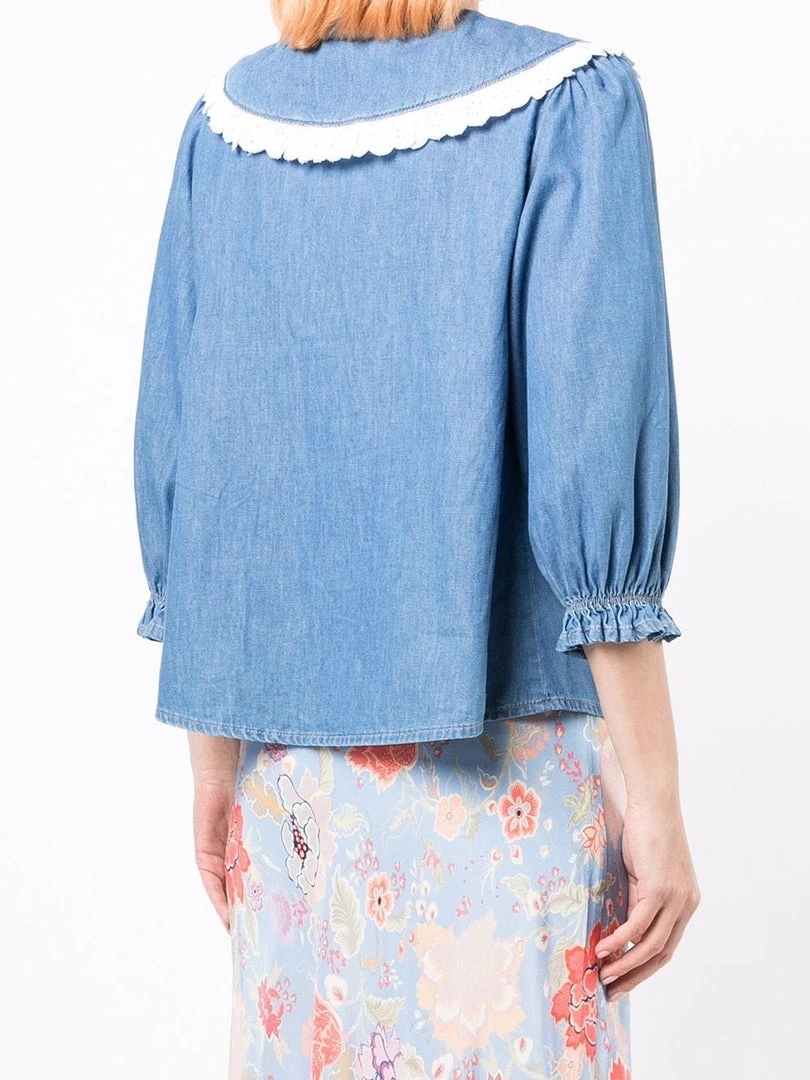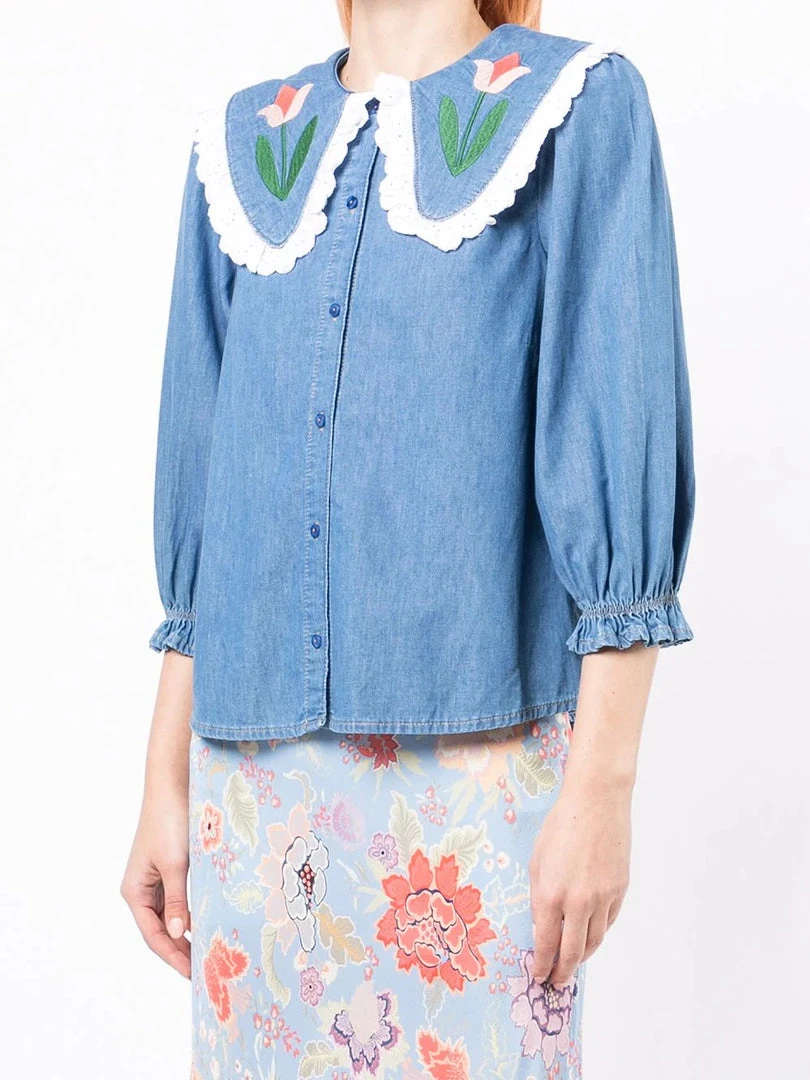 Rixo ‘Davina’ tulip embroidered shirt featuring an oversized collar with eyelet scalloped trimming and pink tulip embroidered details, three-quarter length sleeves with elasticated cuffs, front button fastenings and a medium blue denim wash. Item fits true to size. Model is wearing a size XS.Â