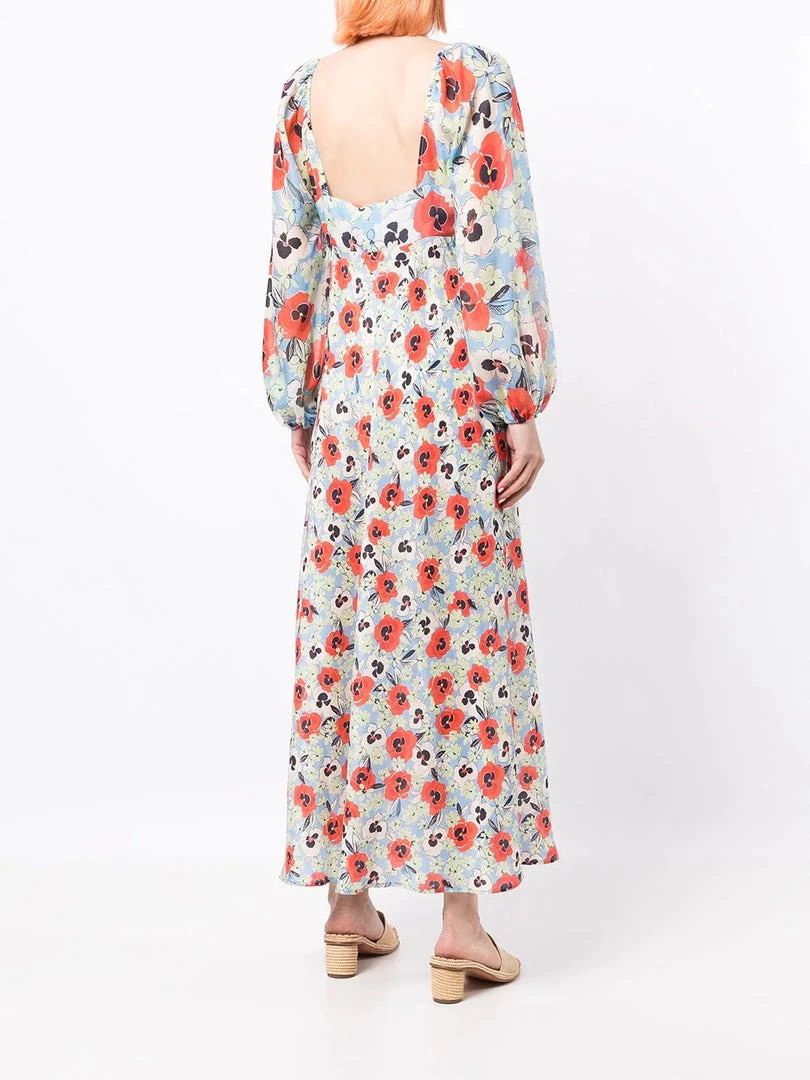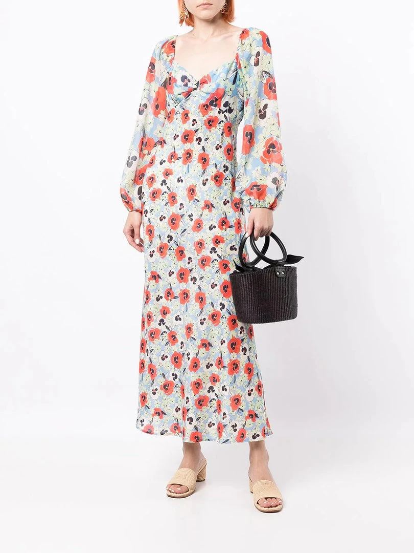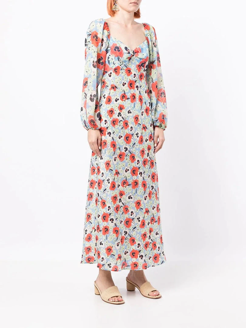 Rixo sheer baby blue ‘Gio’ pansy floral midi dress featuring a sweetheart neckline, elasticated shoulders, long puff sleeves with elasticated cuffs, a side zip fastening, an empire waistline, a multicoloured pansy floral print and a midi length. Item fits true to size. Model is wearing a size XS.Â