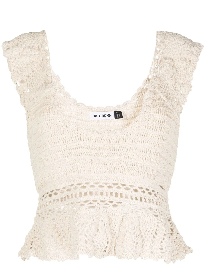 Rixo cream ‘Indiana’ crochet top featuring a round neck, a lower round backline, thick shoulder straps, a peplum style hem and pulls on. Item fits true to size. Model is wearing a size XS.